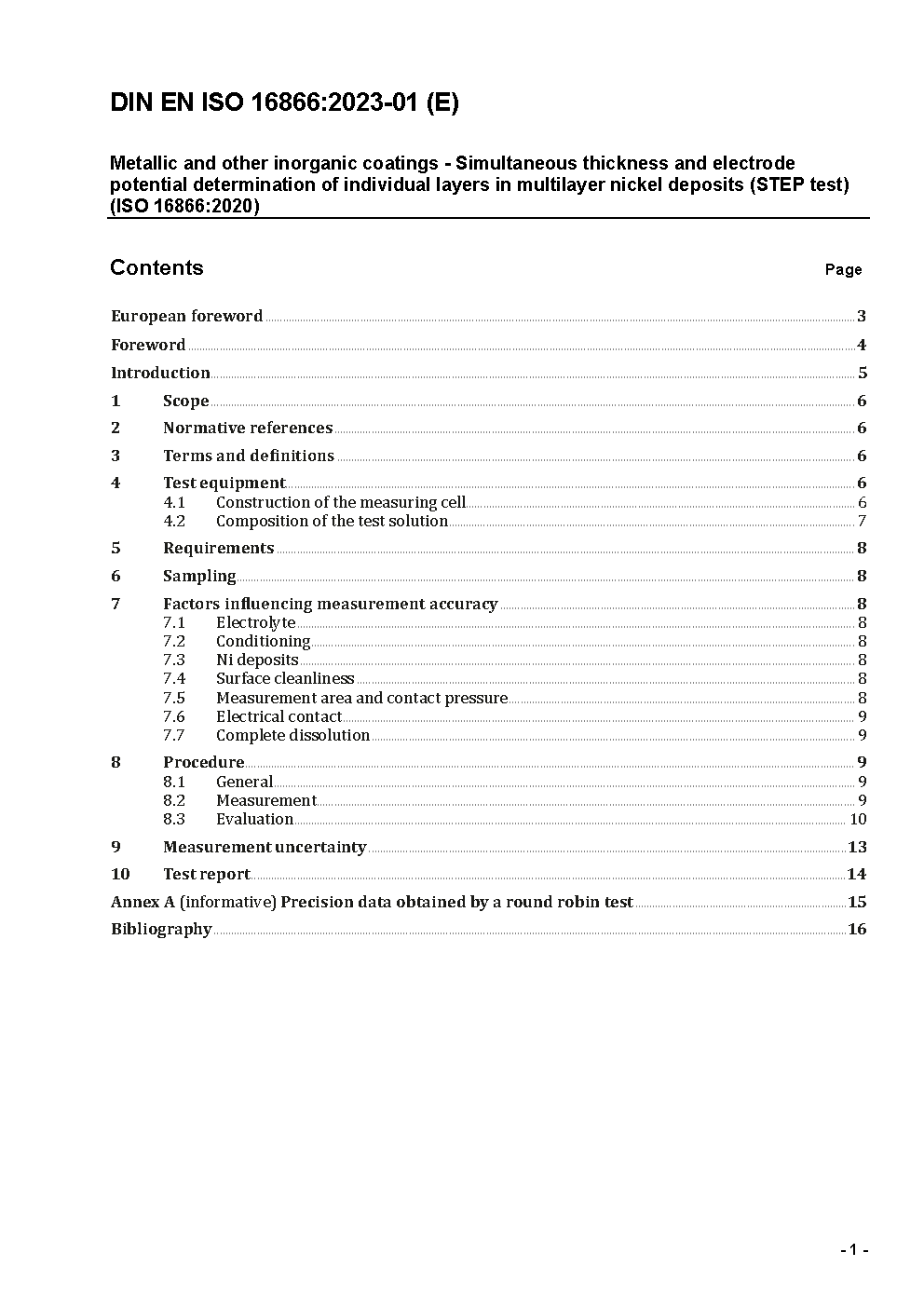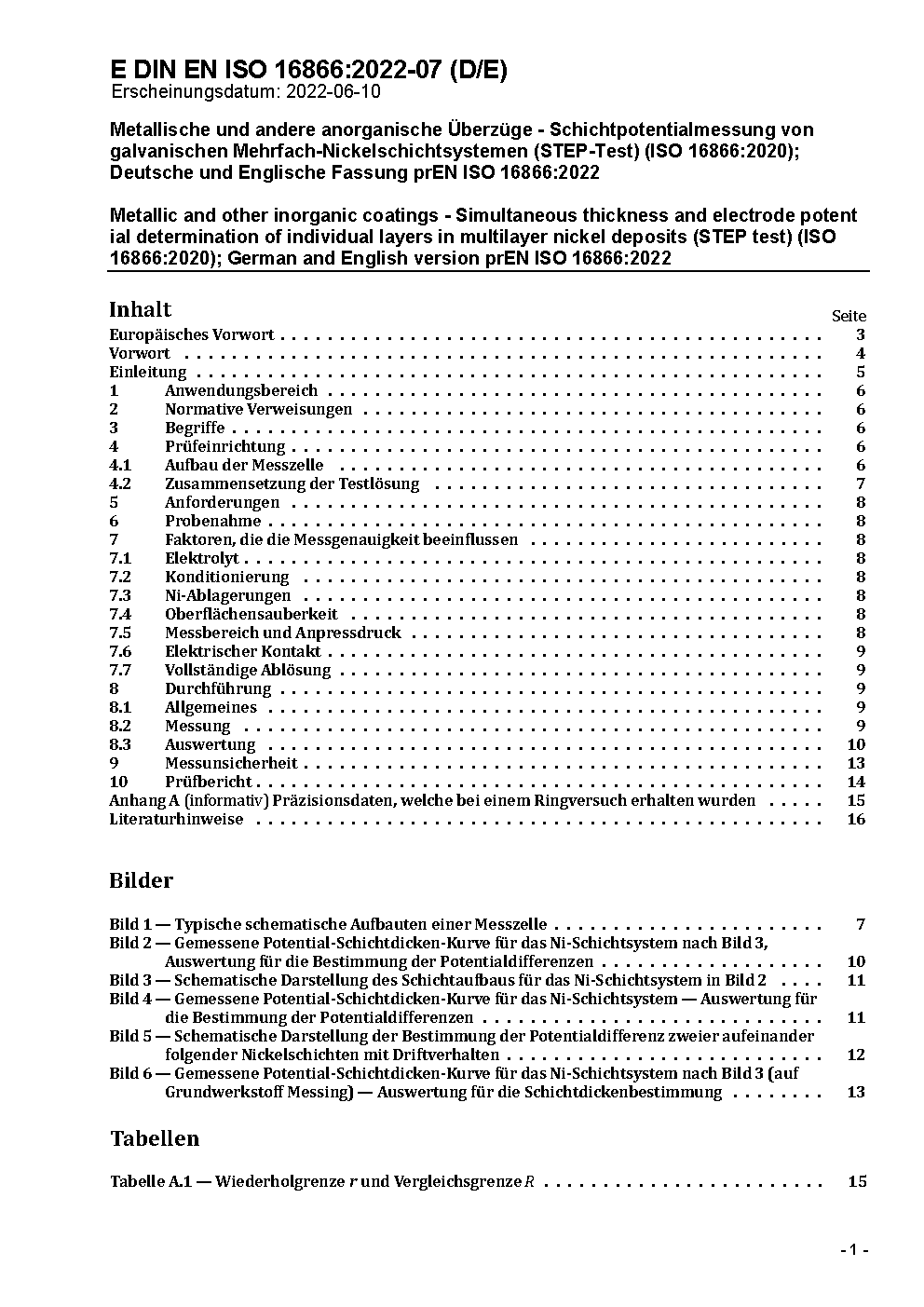 Metallische und andere anorganische Überzüge - Schichtpotentialmessung von galvanischen Mehrfach-Nickelschichtsystemen (STEP-Test) (ISO 16866:2020); Deutsche Fassung EN ISO 16866:2022