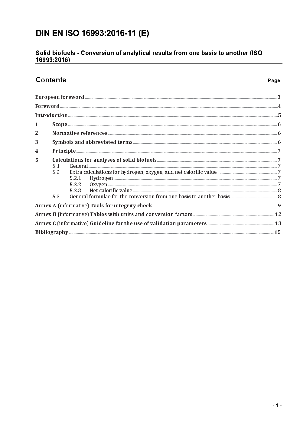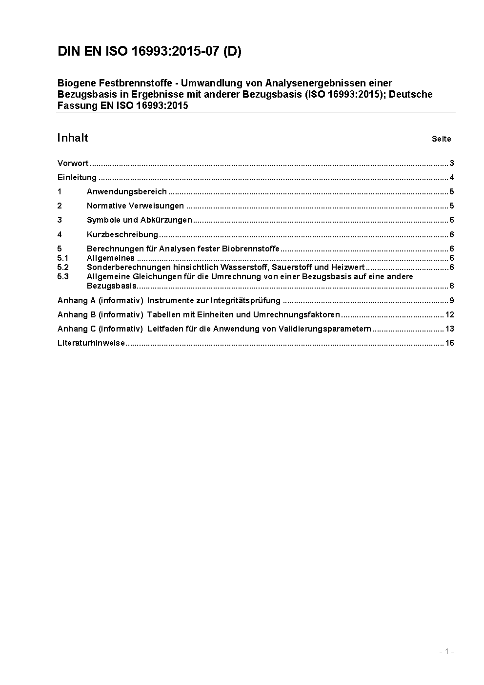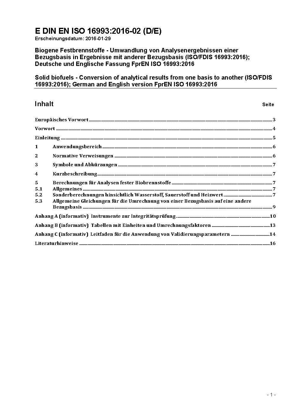 Biogene Festbrennstoffe - Umwandlung von Analysenergebnissen einer Bezugsbasis in Ergebnisse mit anderer Bezugsbasis (ISO 16993:2016); Deutsche Fassung EN ISO 16993:2016