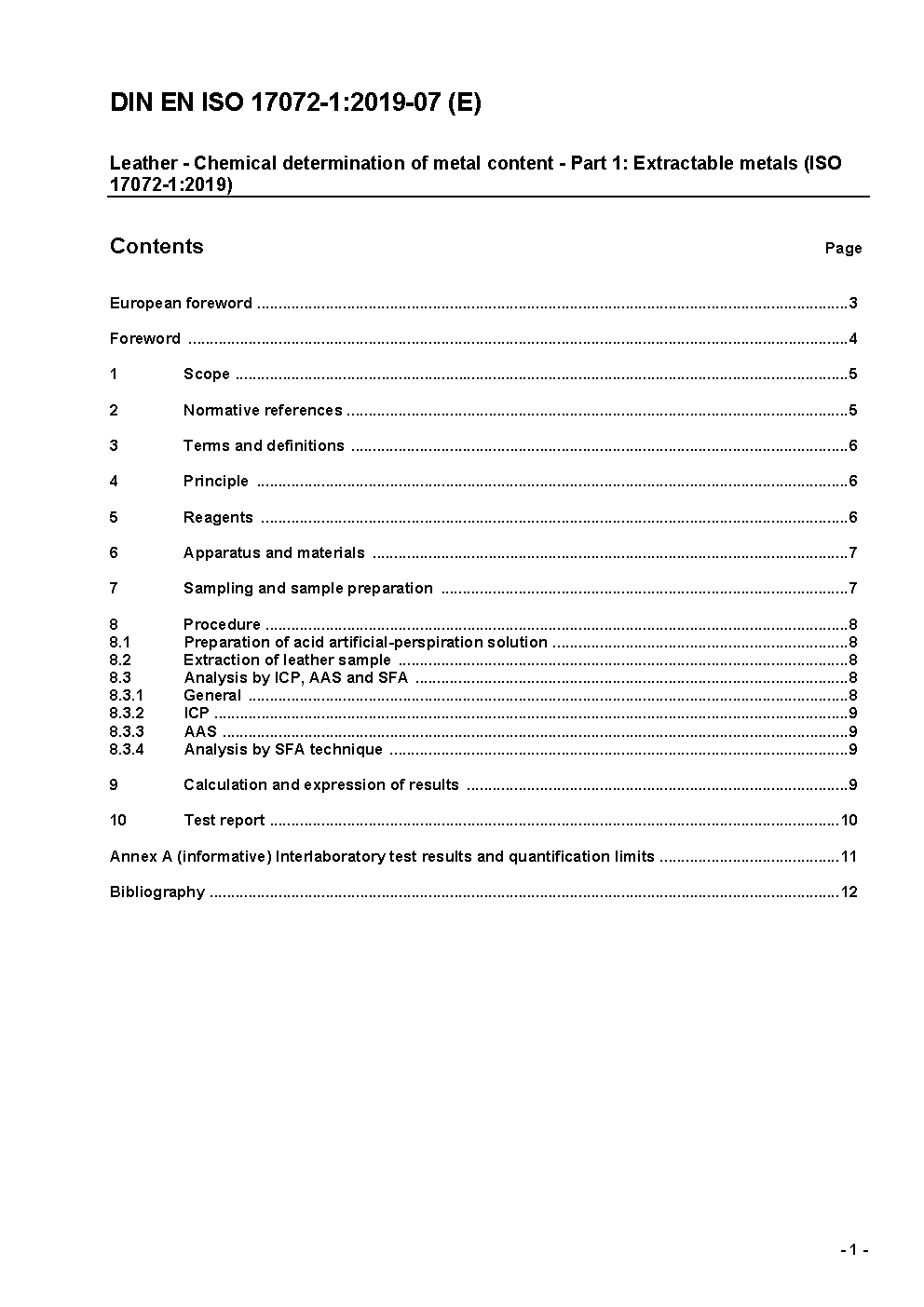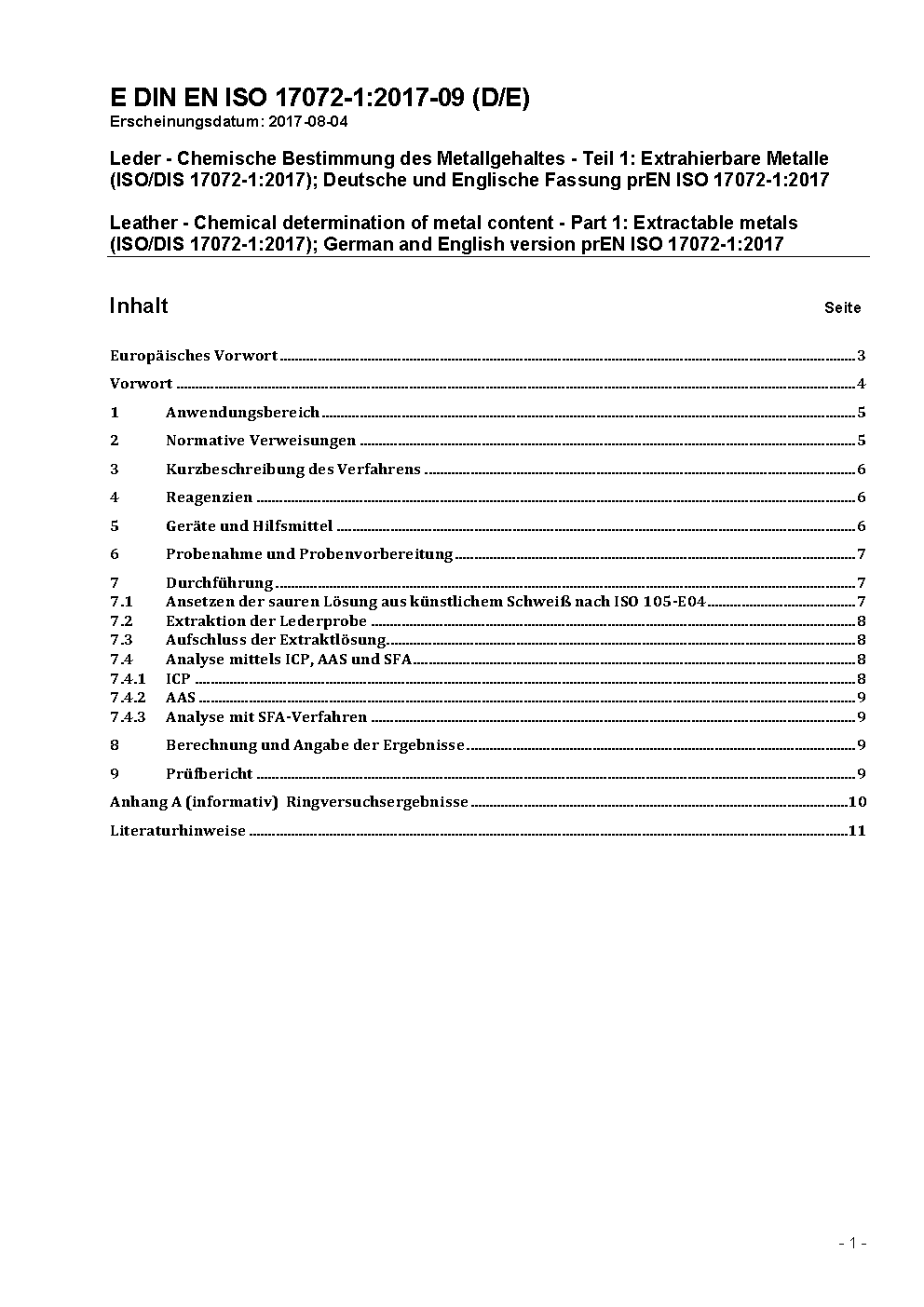 Leder - Chemische Bestimmung des Metallgehaltes - Teil 1: Extrahierbare Metalle (ISO 17072-1:2011); Deutsche Fassung EN ISO 17072-1:2011