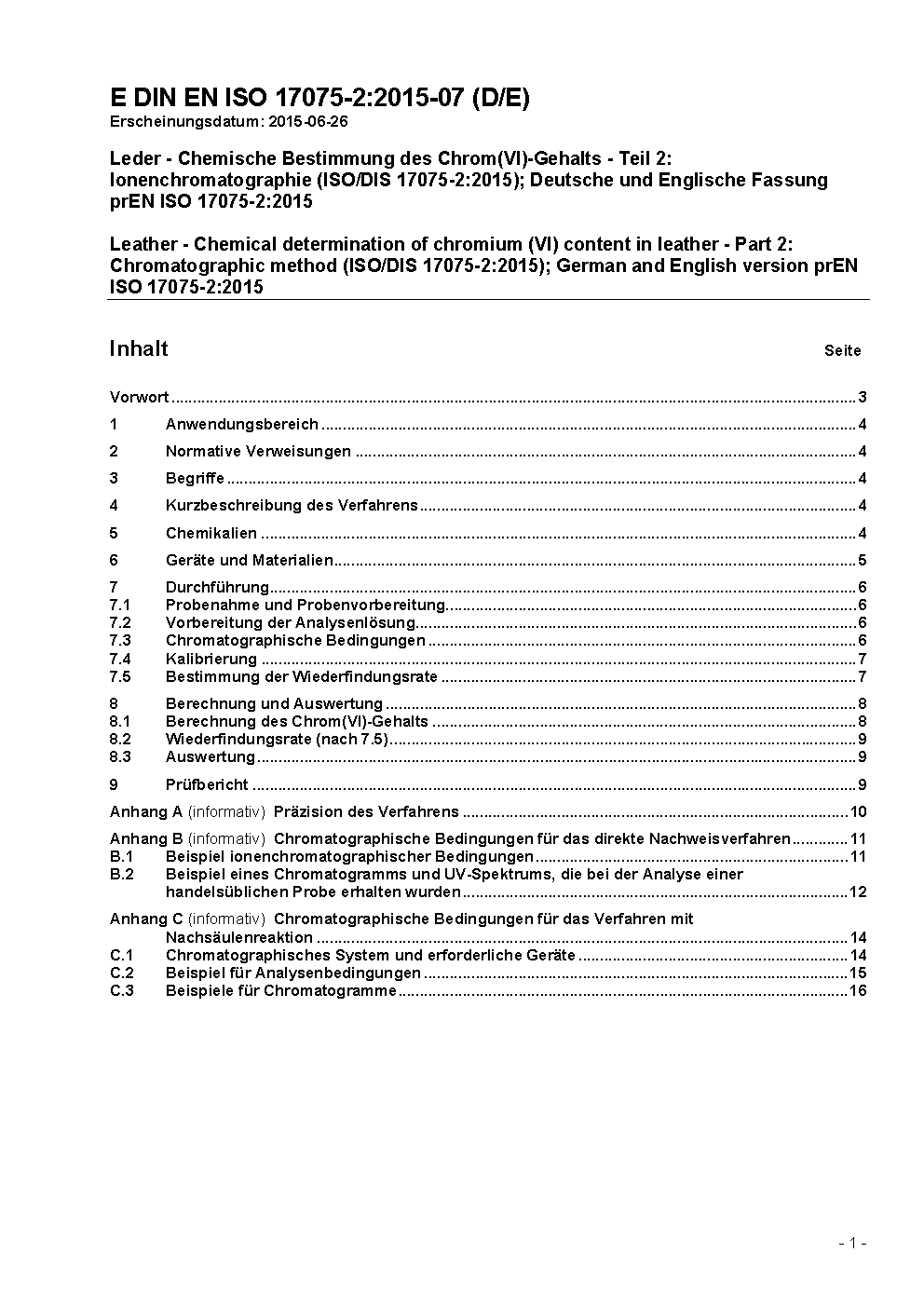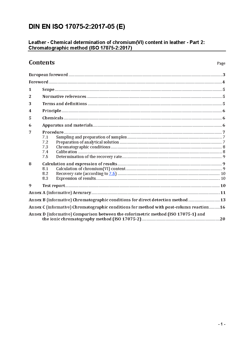Leder - Chemische Bestimmung des Chrom(VI)-Gehalts in Leder - Teil 2: Chromatographie (ISO 17075-2:2017); Deutsche Fassung EN ISO 17075-2:2017