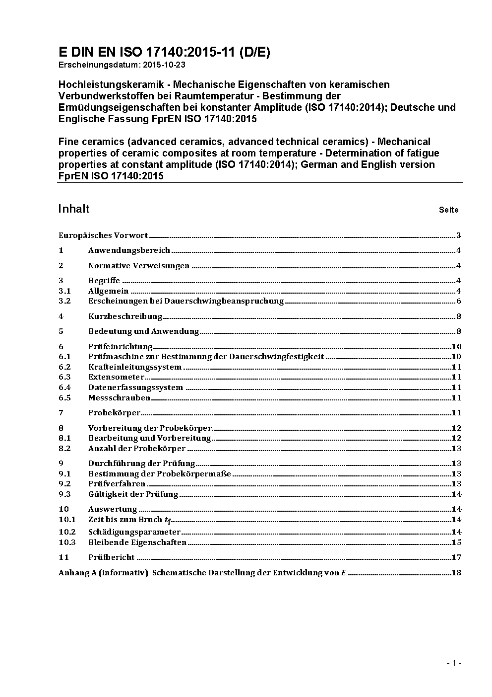 Hochleistungskeramik - Mechanische Eigenschaften von keramischen Verbundwerkstoffen bei Raumtemperatur - Bestimmung der Ermüdungseigenschaften bei konstanter Amplitude (ISO 17140:2014); Deutsche Fassung EN ISO 17140:2016