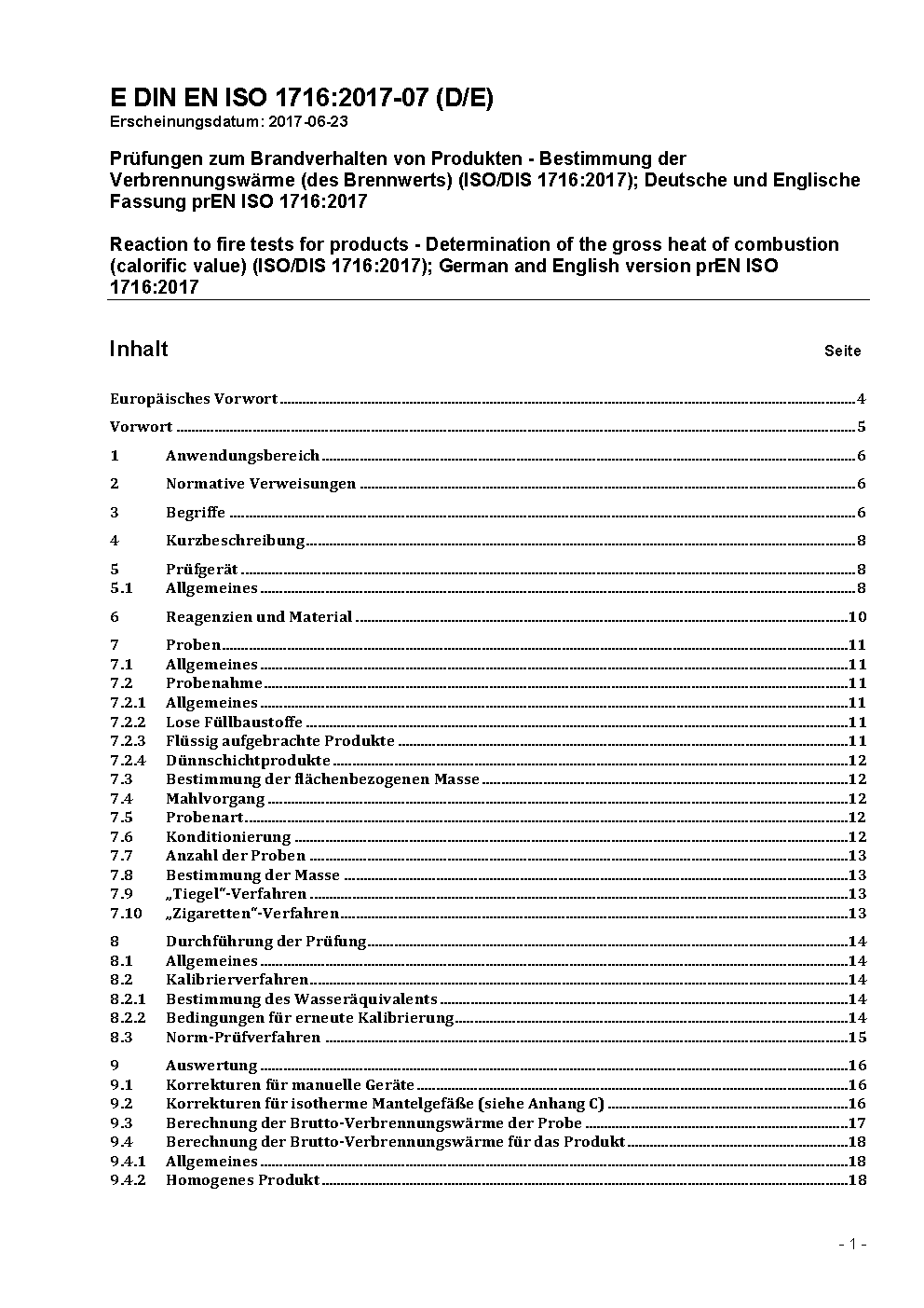 Prüfungen zum Brandverhalten von Produkten - Bestimmung der Verbrennungswärme (des Brennwerts) (ISO/DIS 1716:2017); Deutsche und Englische Fassung prEN ISO 1716:2017