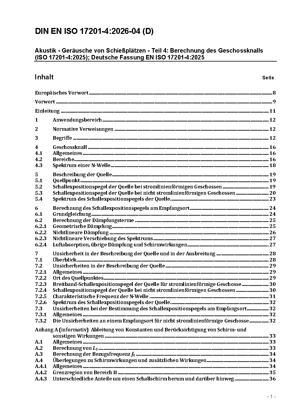 Acoustics - Noise from shooting ranges - Part 4: Prediction of projectile noise (ISO/DIS 17201-4:2004); German version prEN ISO 17201-4:2004