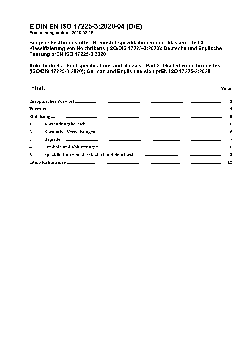 Feste Biobrennstoffe - Brennstoffspezifikationen und -klassen - Teil 3: Einteilung von Holzbriketts (ISO/DIS 17225-3:2012); Deutsche Fassung prEN ISO 17225-3:2012
