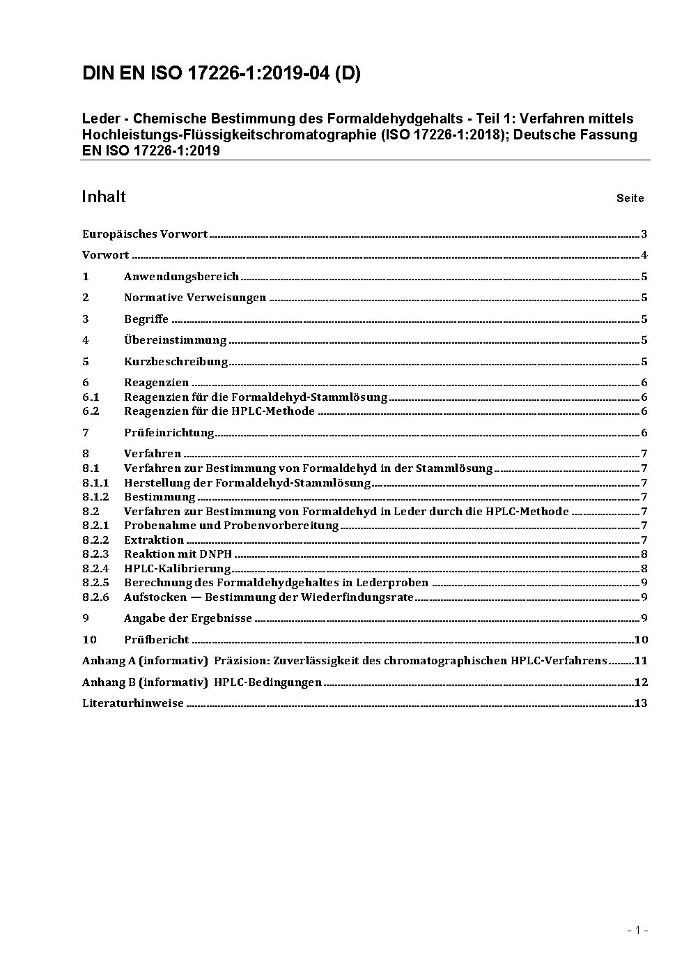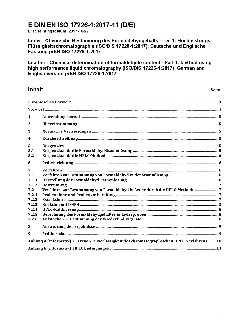 Leder - Chemische Bestimmung des Formaldehydgehalts - Teil 1: Verfahren mittels Flüssigkeitschromatographie (ISO 17226-1:2021); Deutsche Fassung EN ISO 17226-1:2021