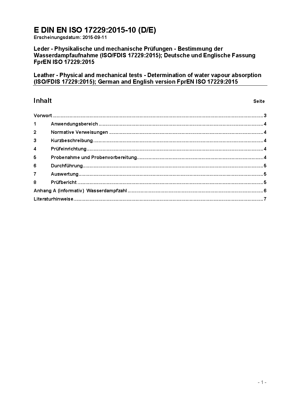 Leder - Physikalische und mechanische Prüfungen - Bestimmung der Wasserdampfaufnahme (ISO/FDIS 17229:2015); Deutsche und Englische Fassung FprEN ISO 17229:2015