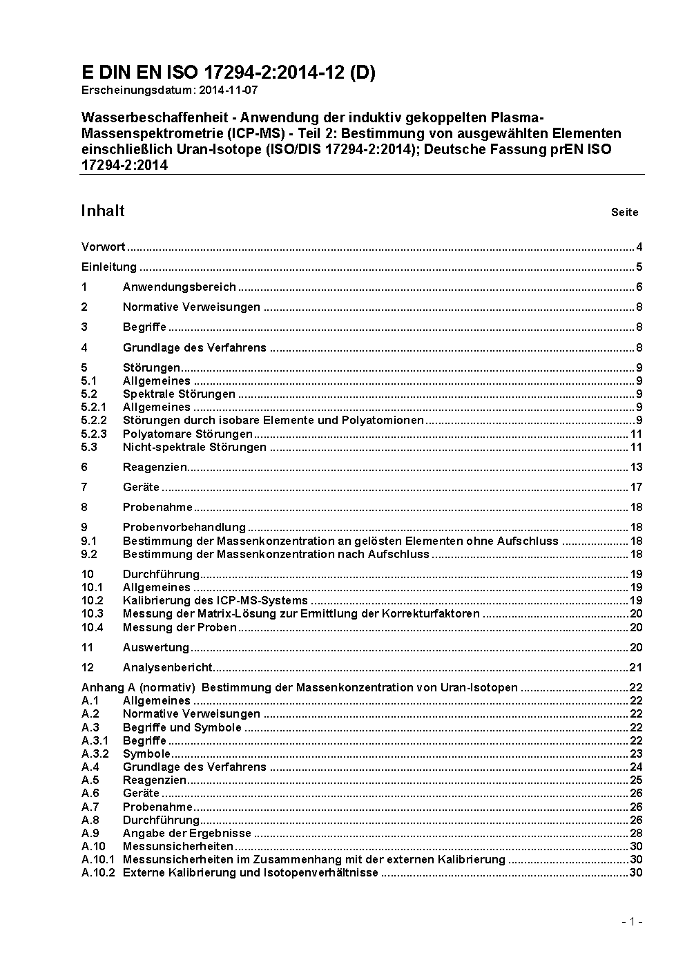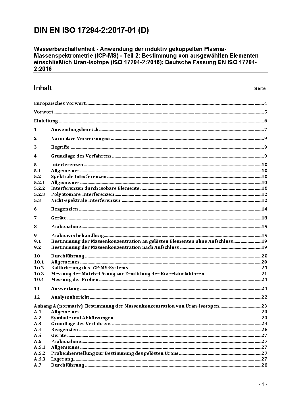 Wasserbeschaffenheit - Anwendung der induktiv gekoppelten Plasma-Massenspektrometrie (ICP-MS) - Teil 2: Bestimmung von ausgewählten Elementen einschließlich Uran-Isotope (ISO 17294-2:2016); Deutsche Fassung EN ISO 17294-2:2016