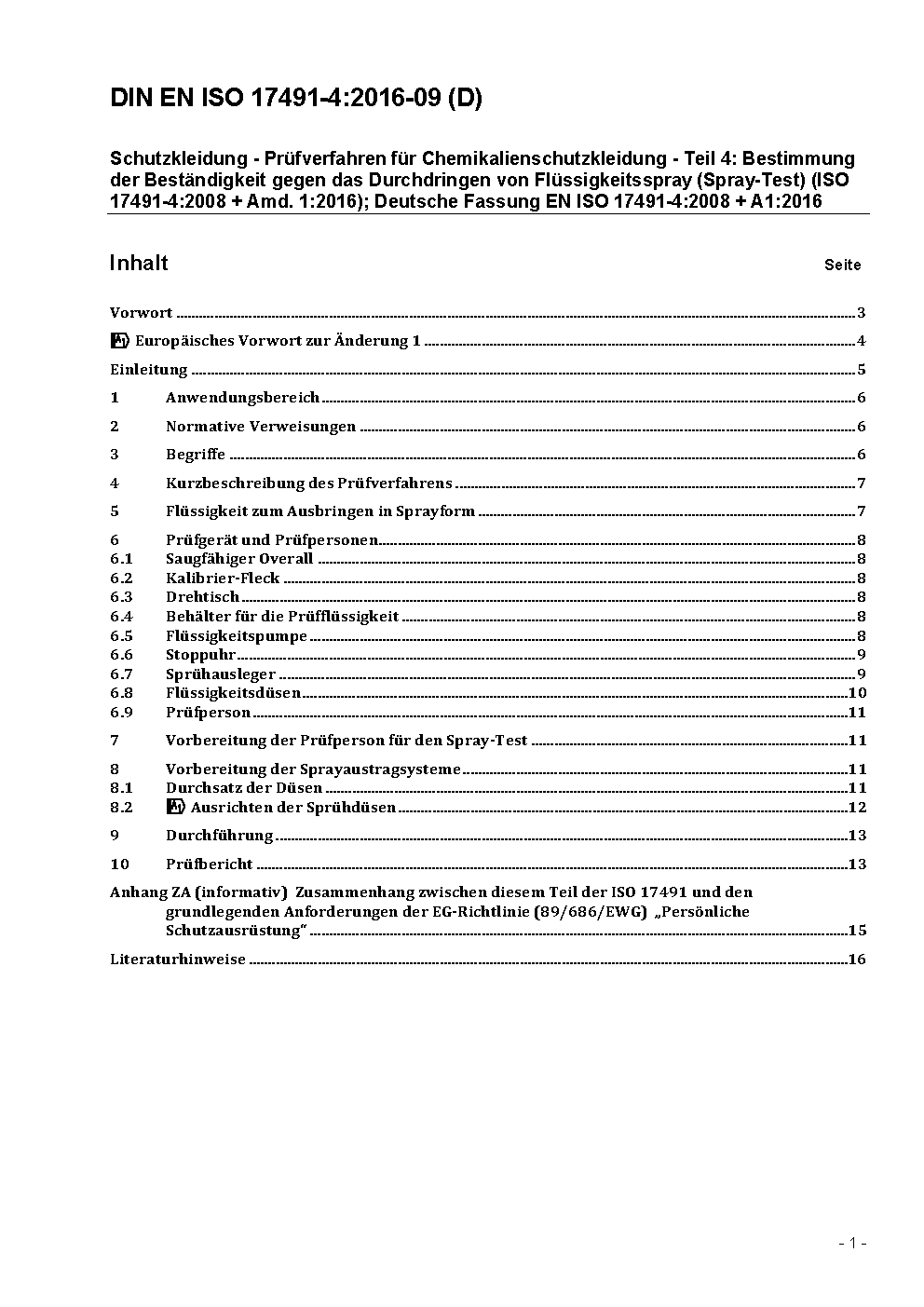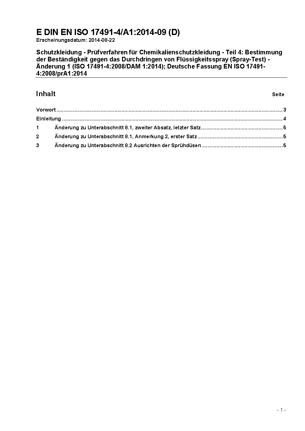 Schutzkleidung - Prüfverfahren für Chemikalienschutzkleidung - Teil 4: Bestimmung der Beständigkeit gegen das Durchdringen von Flüssigkeitsspray (Spray-Test) - Änderung 1 (ISO 17491-4:2008/DAM 1:2014); Deutsche Fassung EN ISO 17491-4:2008/prA1:2014