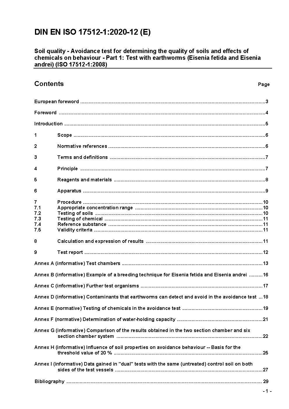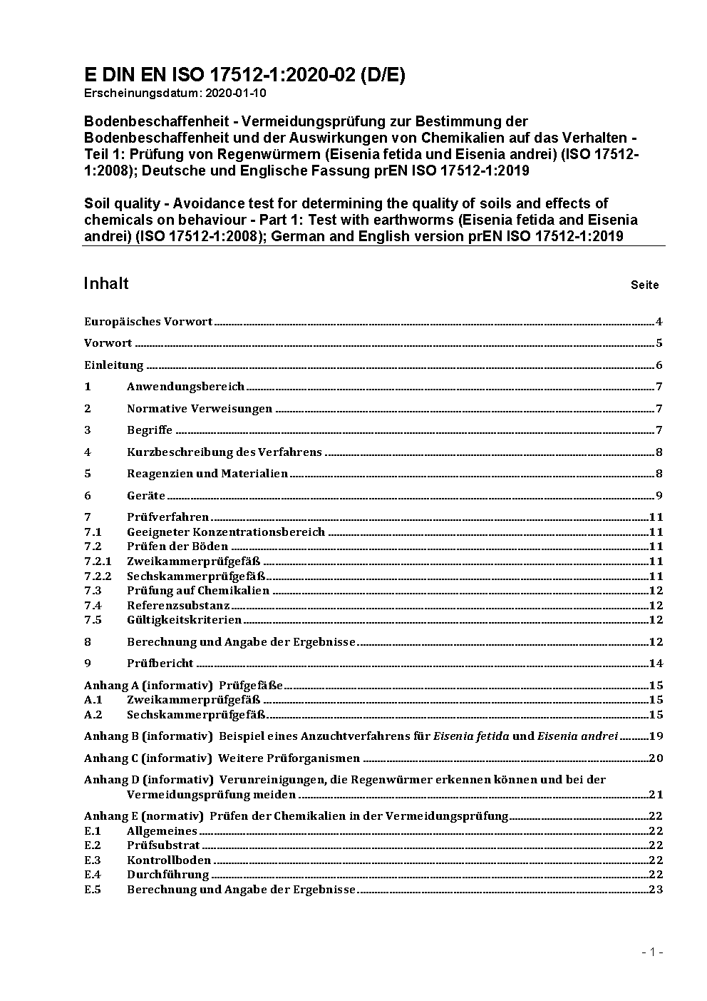 Bodenbeschaffenheit - Vermeidungsprüfung zur Bestimmung der Bodenbeschaffenheit und der Auswirkungen von Chemikalien auf das Verhalten - Teil 1: Prüfung von Regenwürmern (Eisenia fetida und Eisenia andrei) (ISO 17512-1:2008); Deutsche und Englische Fassung prEN ISO 17512-1:2019