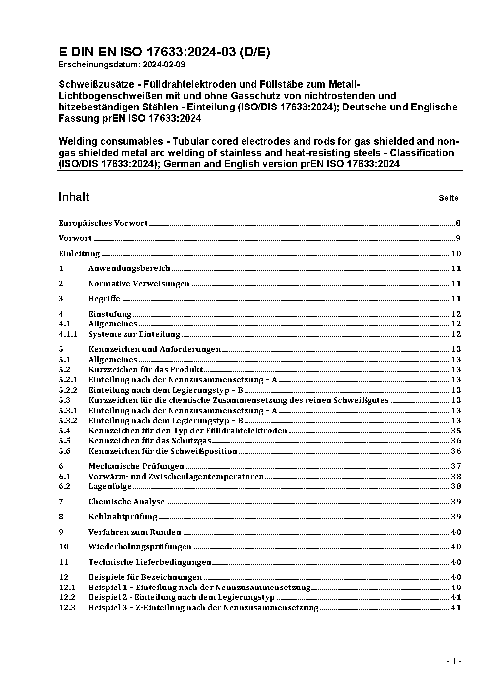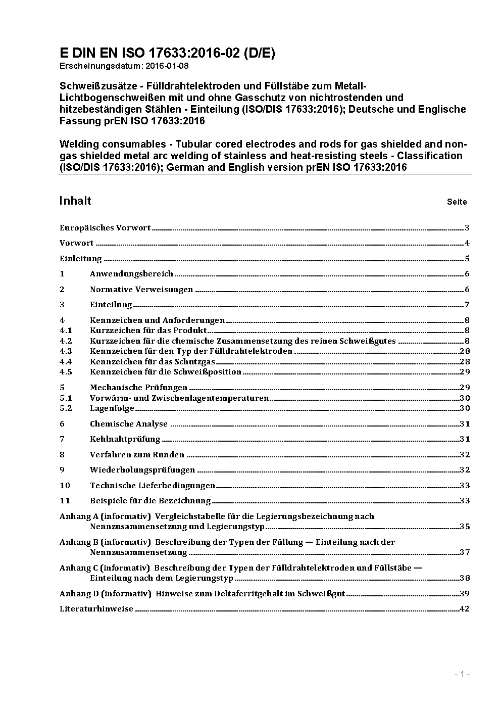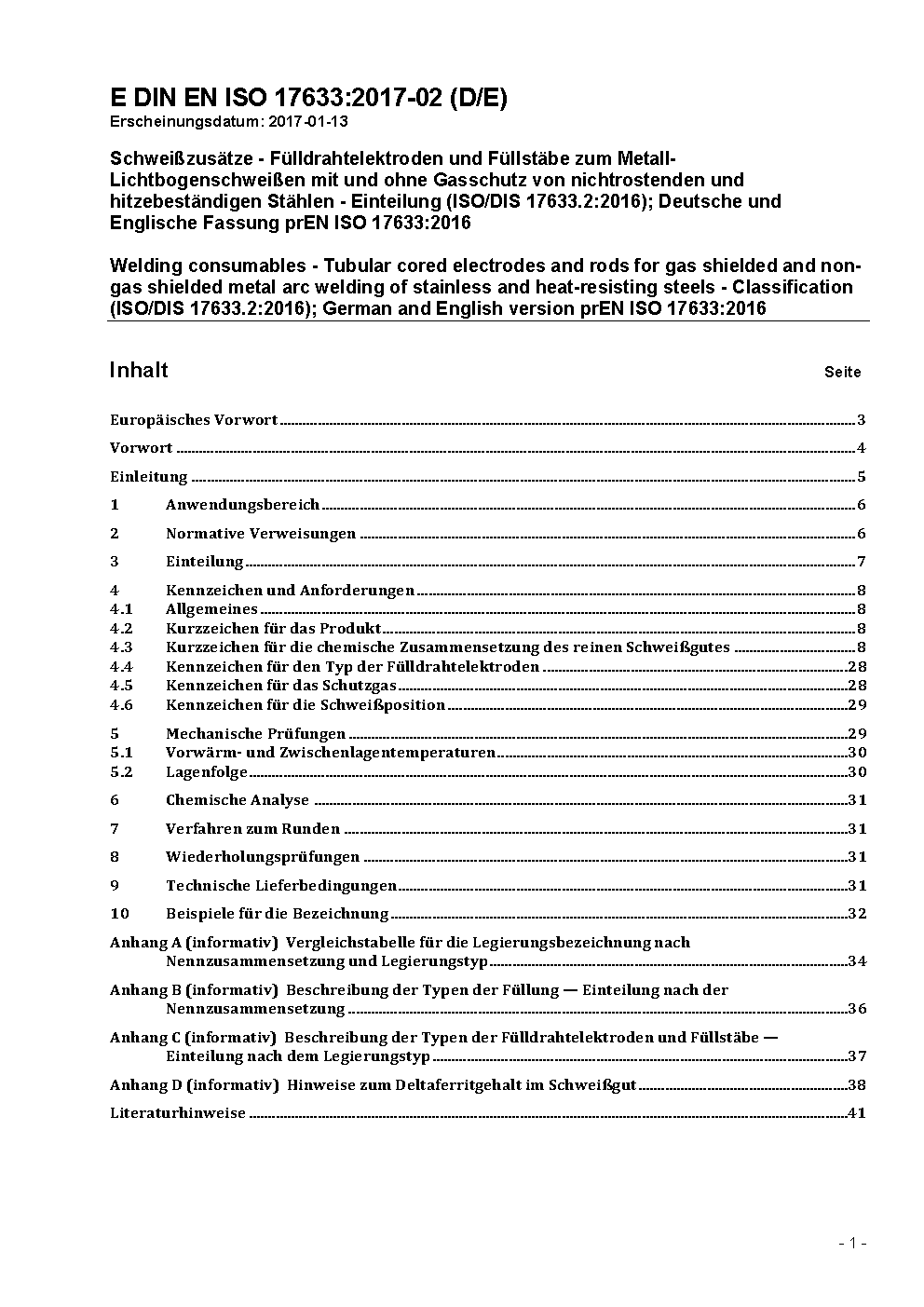 Welding consumables - Tubular cored electrodes and rods for gas shielded and non-gas shielded metal arc welding of stainless and heat-resisting steels - Classification (ISO 17633:2017); German version EN ISO 17633:2018