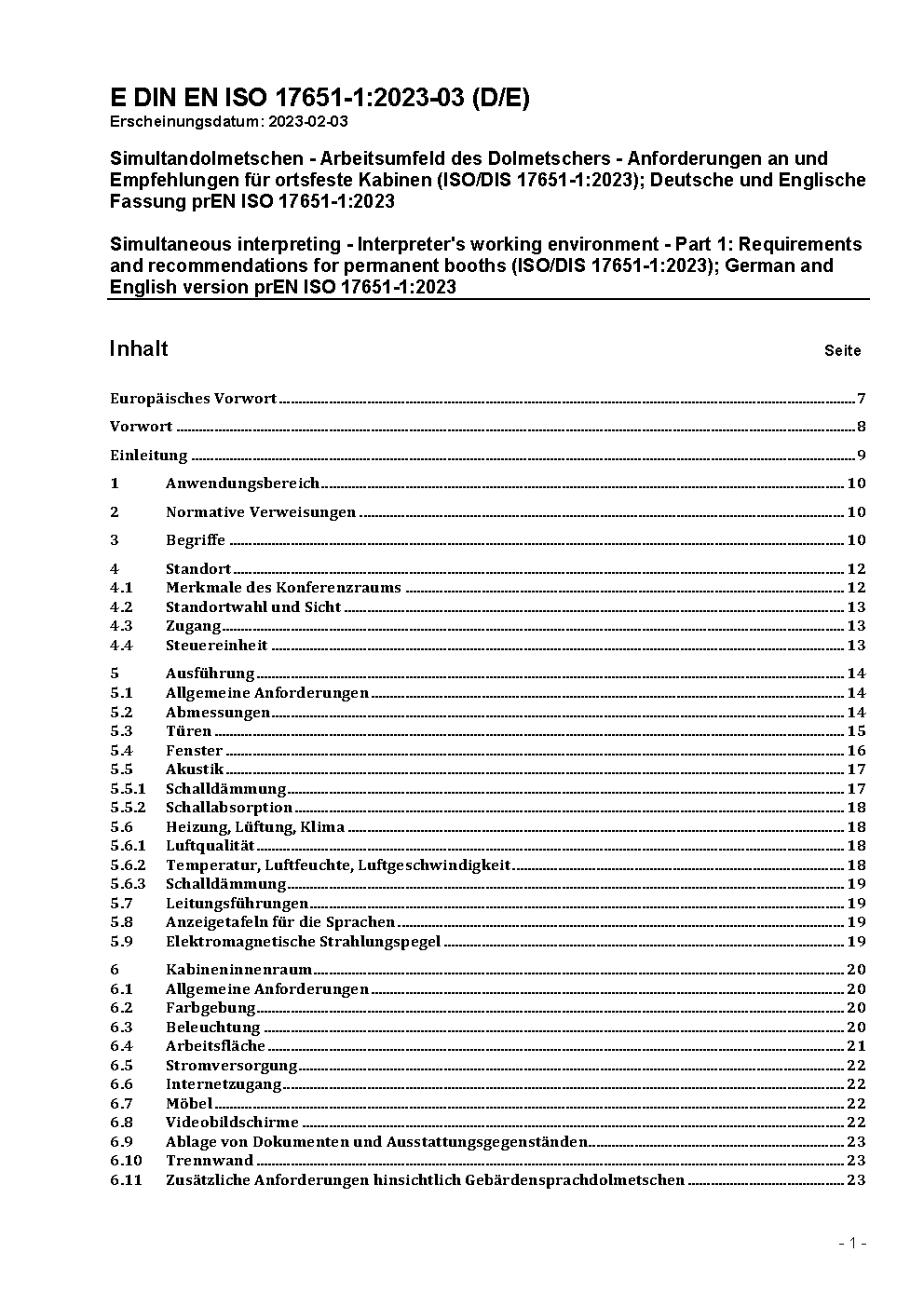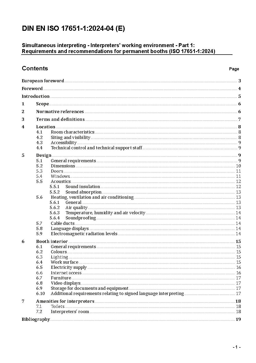 Simultaneous interpreting - Interpreters' working environment - Part 1: Requirements and recommendations for permanent booths (ISO 17651-1:2024); German version EN ISO 17651-1:2024.