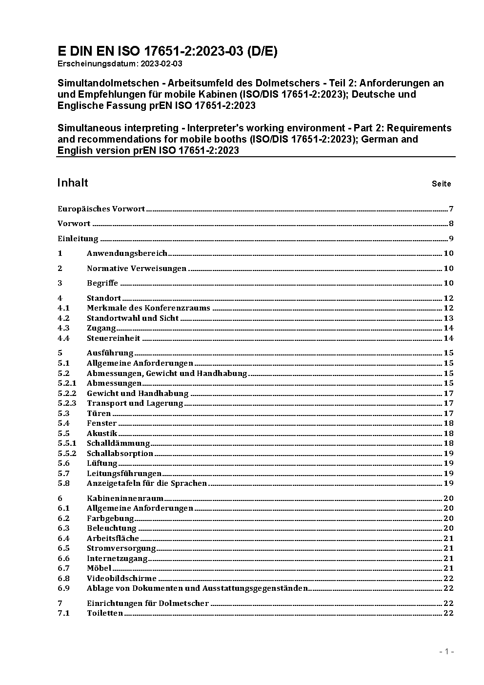 Simultandolmetschen - Arbeitsumfeld des Dolmetschers - Teil 2: Anforderungen an und Empfehlungen für mobile Kabinen (ISO/DIS 17651-2:2023); Deutsche und Englische Fassung prEN ISO 17651-2:2023