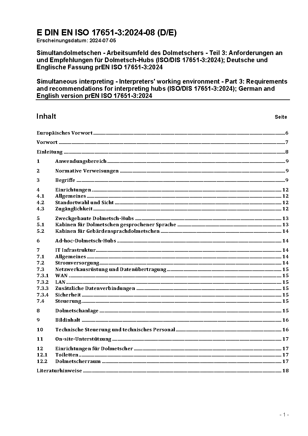 Simultaneous interpreting - Interpreters' working environment - Part 3: Requirements and recommendations for interpreting hubs (ISO/DIS 17651-3:2024); German and English version prEN ISO 17651-3:2024