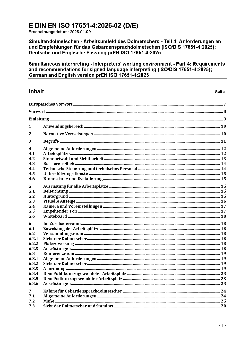 Simultaneous interpreting - Interpreters' working environment - Part 4: Requirements and recommendations for signed language interpreting (ISO/DIS 17651-4:2025); German and English version prEN ISO 17651-4:2025