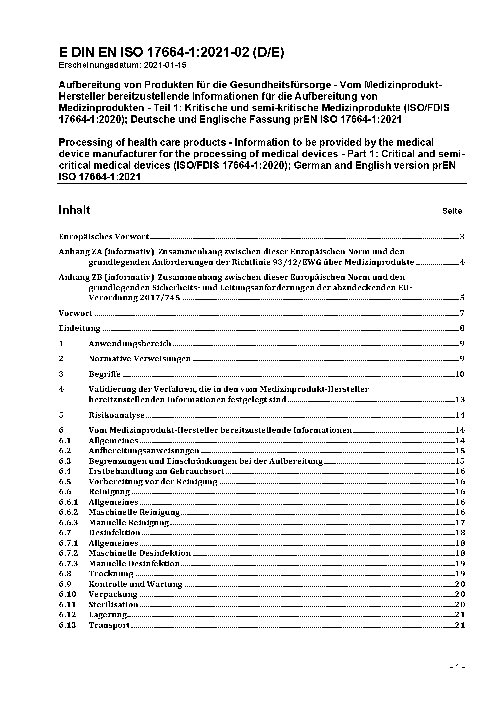Aufbereitung von Produkten für die Gesundheitsfürsorge - Vom Medizinprodukt-Hersteller bereitzustellende Informationen für die Aufbereitung von Medizinprodukten - Teil 1: Kritische und semi-kritische Medizinprodukte (ISO 17664-1:2021); Deutsche Fassung EN ISO 17664-1:2021