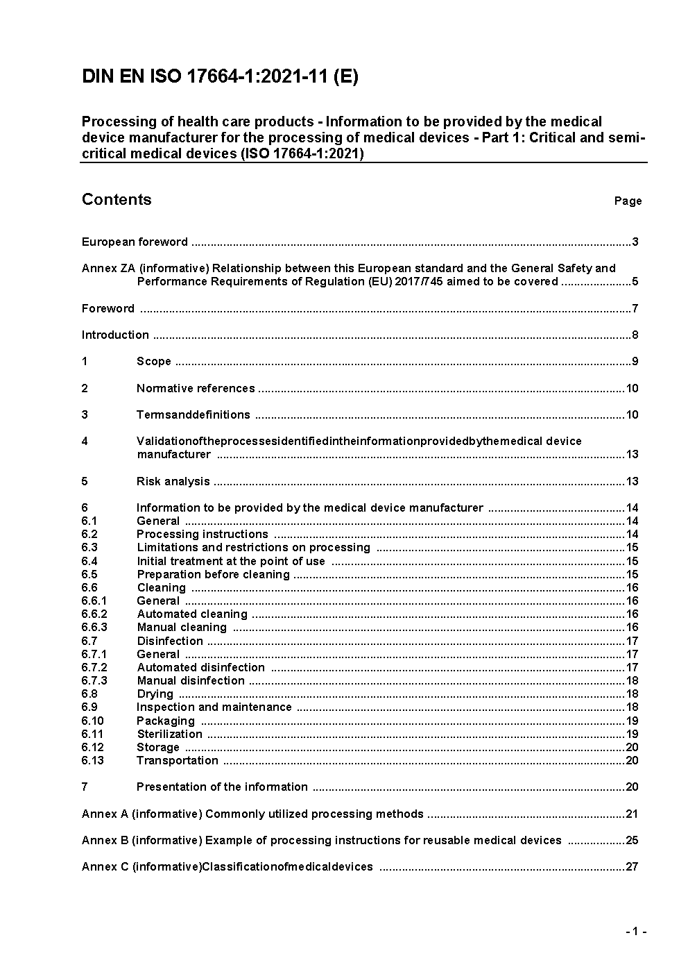 Processing of health care products - Information to be provided by the medical device manufacturer for the processing of medical devices - Part 1: Critical and semi-critical medical devices (ISO 17664-1:2021); German version EN ISO 17664-1:2021