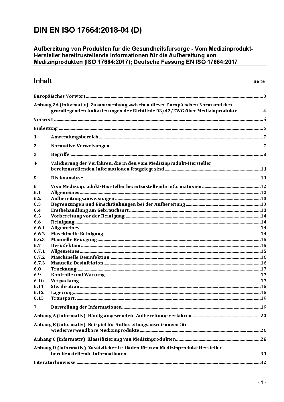 Sterilisation von Medizinprodukten - Vom Hersteller bereitzustellende Informationen für die Aufbereitung von resterilisierbaren Medizinprodukten (ISO 17664:2004); Deutsche Fassung EN ISO 17664:2004