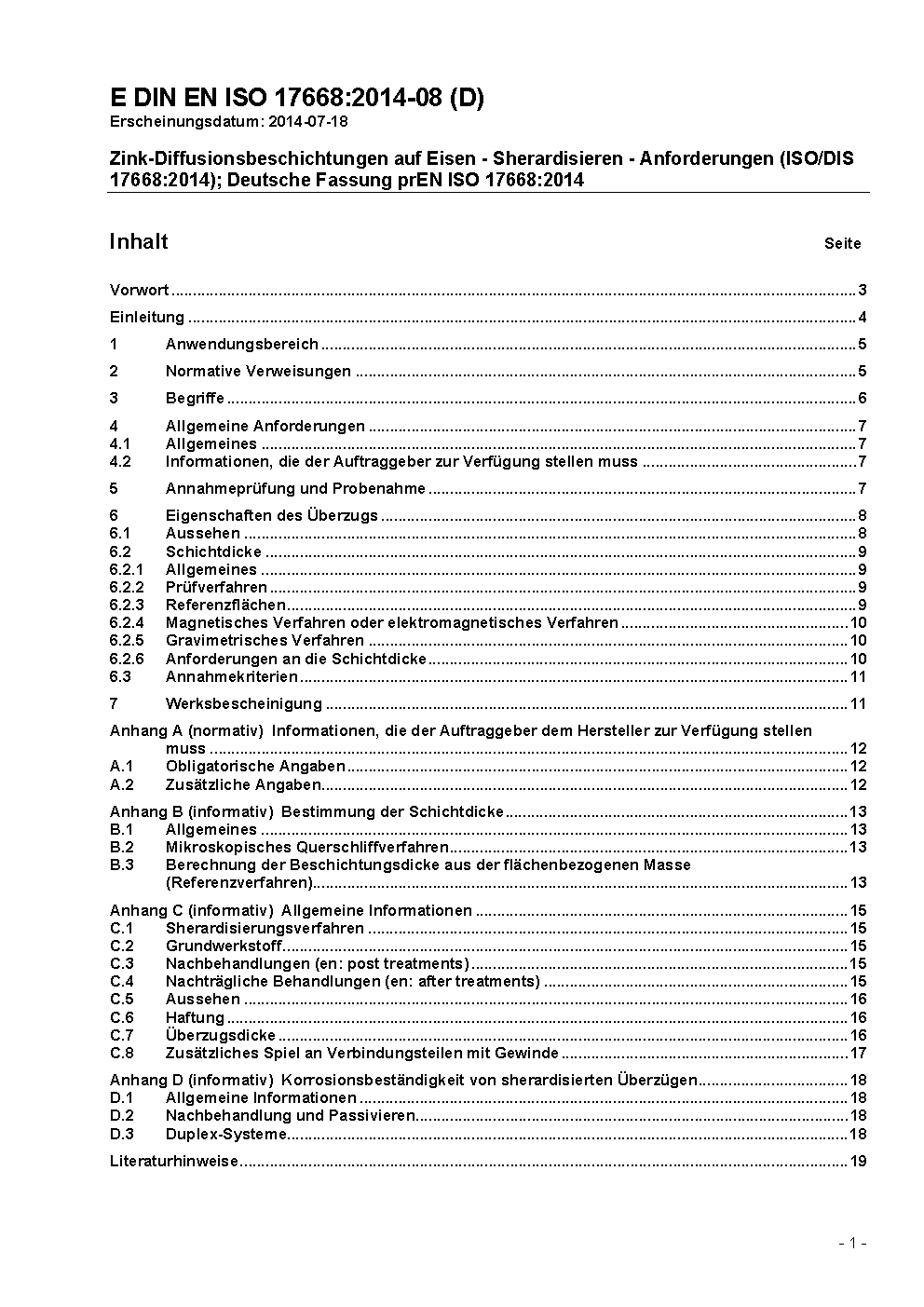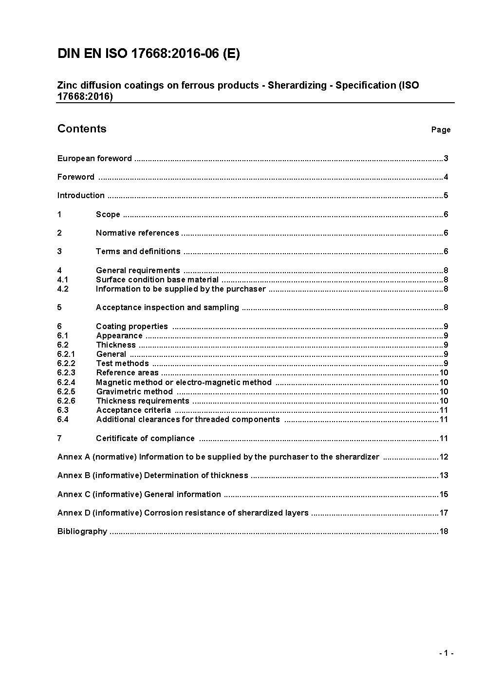 Zinc diffusion coatings on ferrous products - Sherardizing - Specification (ISO 17668:2016); German version EN ISO 17668:2016