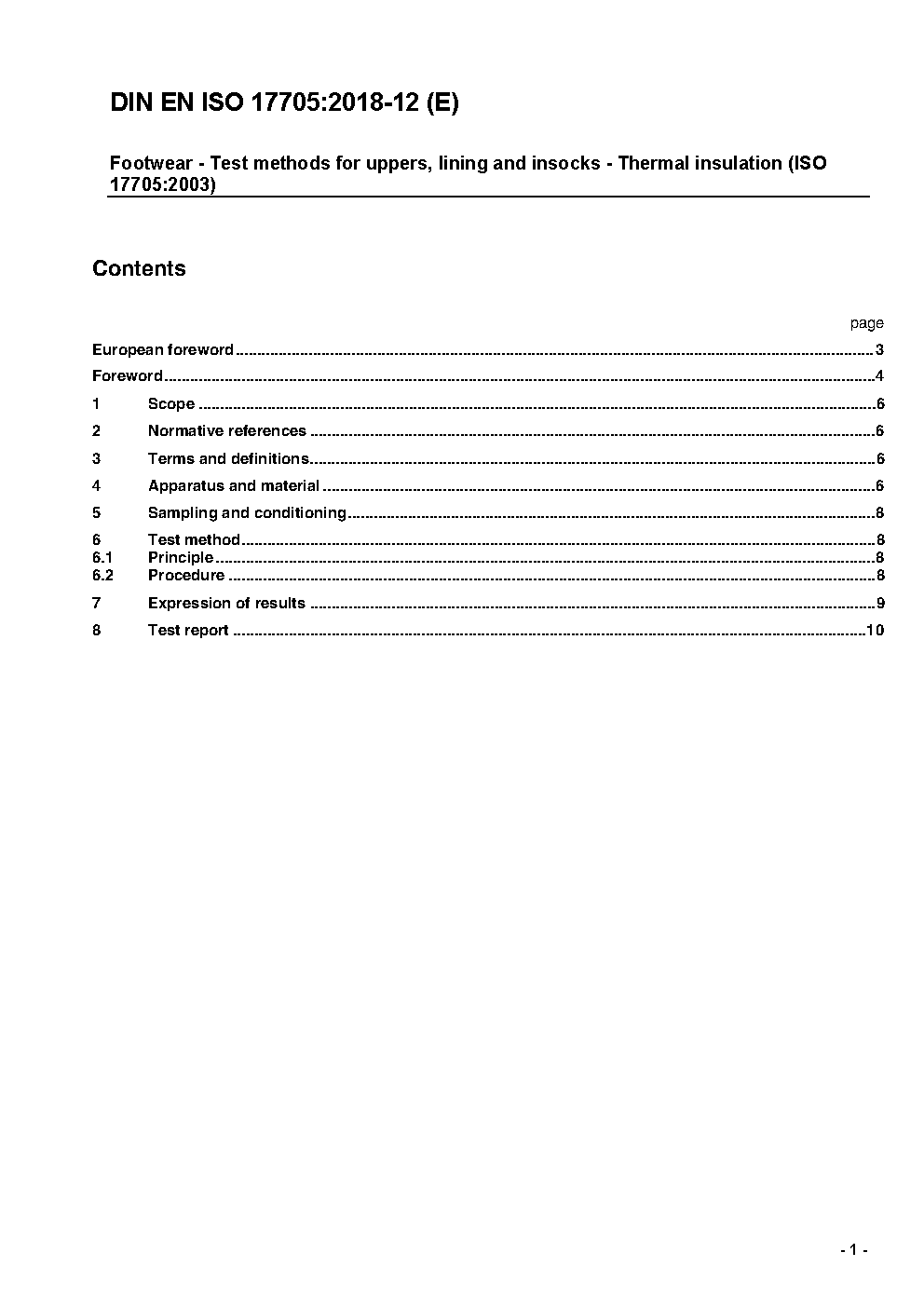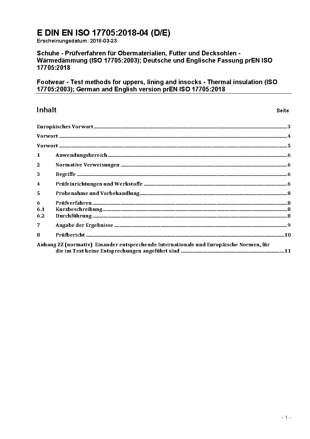 Schuhe - Prüfverfahren für Obermaterialien, Futter und Decksohlen - Wärmedämmung (ISO 17705:2003); Deutsche und Englische Fassung prEN ISO 17705:2018