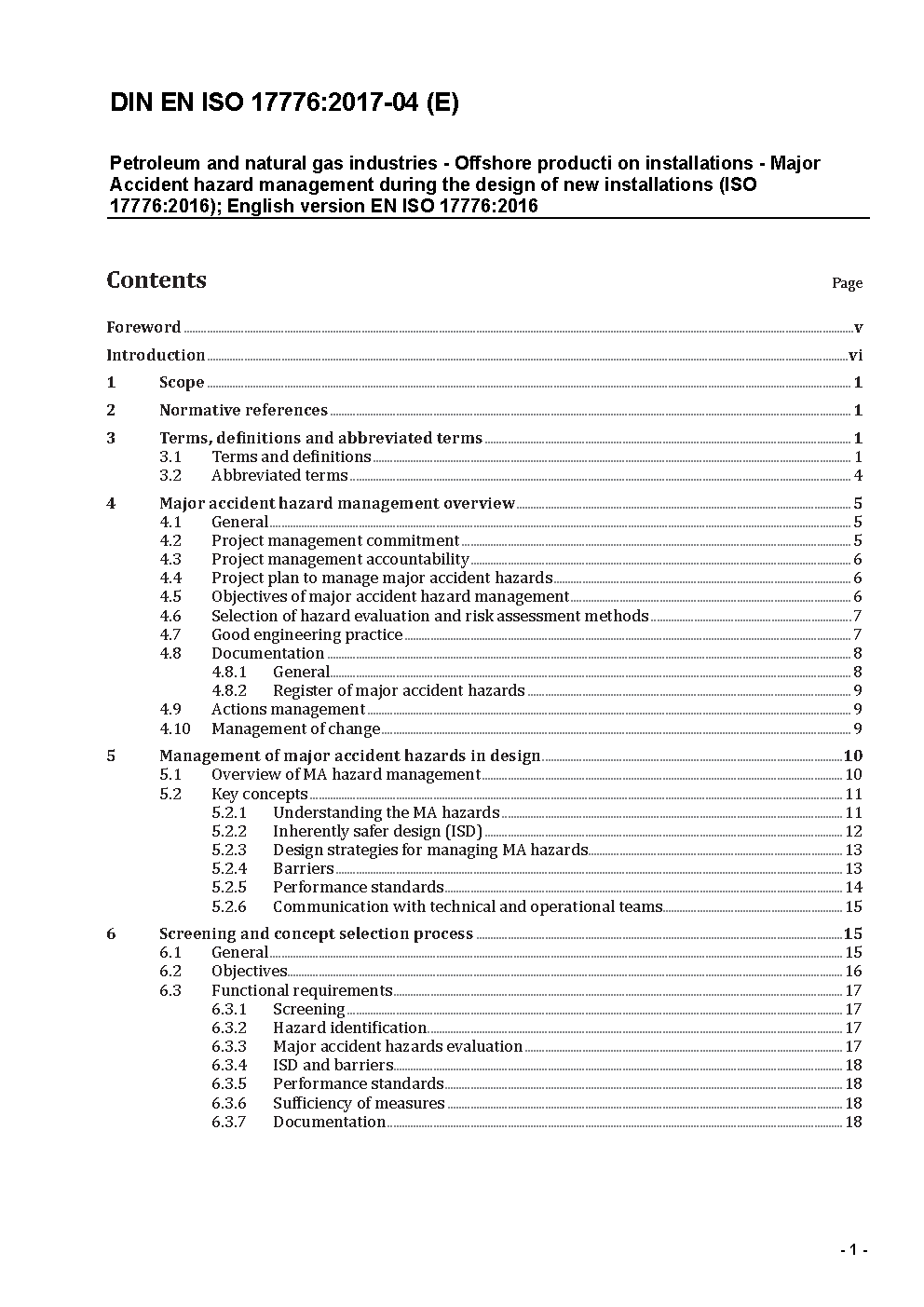 Erdöl- und Erdgasindustrie - Offshore-Produktionsanlagen - Management der Gefährdungen durch schwere Störfälle bei der Konstruktion neuer Offshore-Anlagen (ISO 17776:2016); Englische Fassung EN ISO 17776:2016