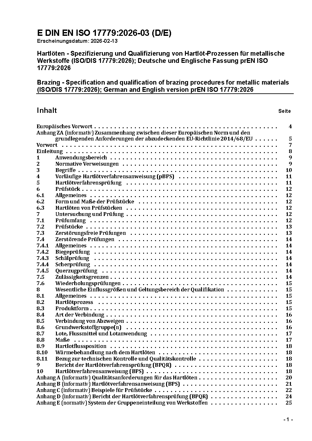 Hartlöten - Spezifizierung und Qualifizierung von Hartlöt-Prozessen für metallische Werkstoffe (ISO/DIS 17779:2026); Deutsche und Englische Fassung prEN ISO 17779:2026