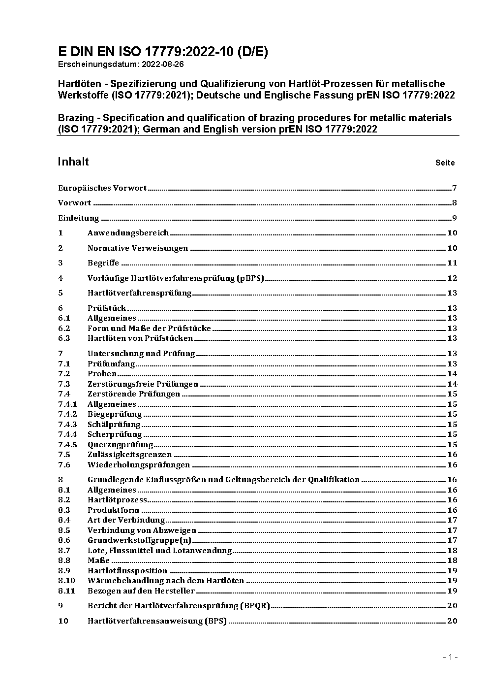Brazing - Specification and qualification of brazing procedures for metallic materials (ISO/DIS 17779:2026); German and English version prEN ISO 17779:2026