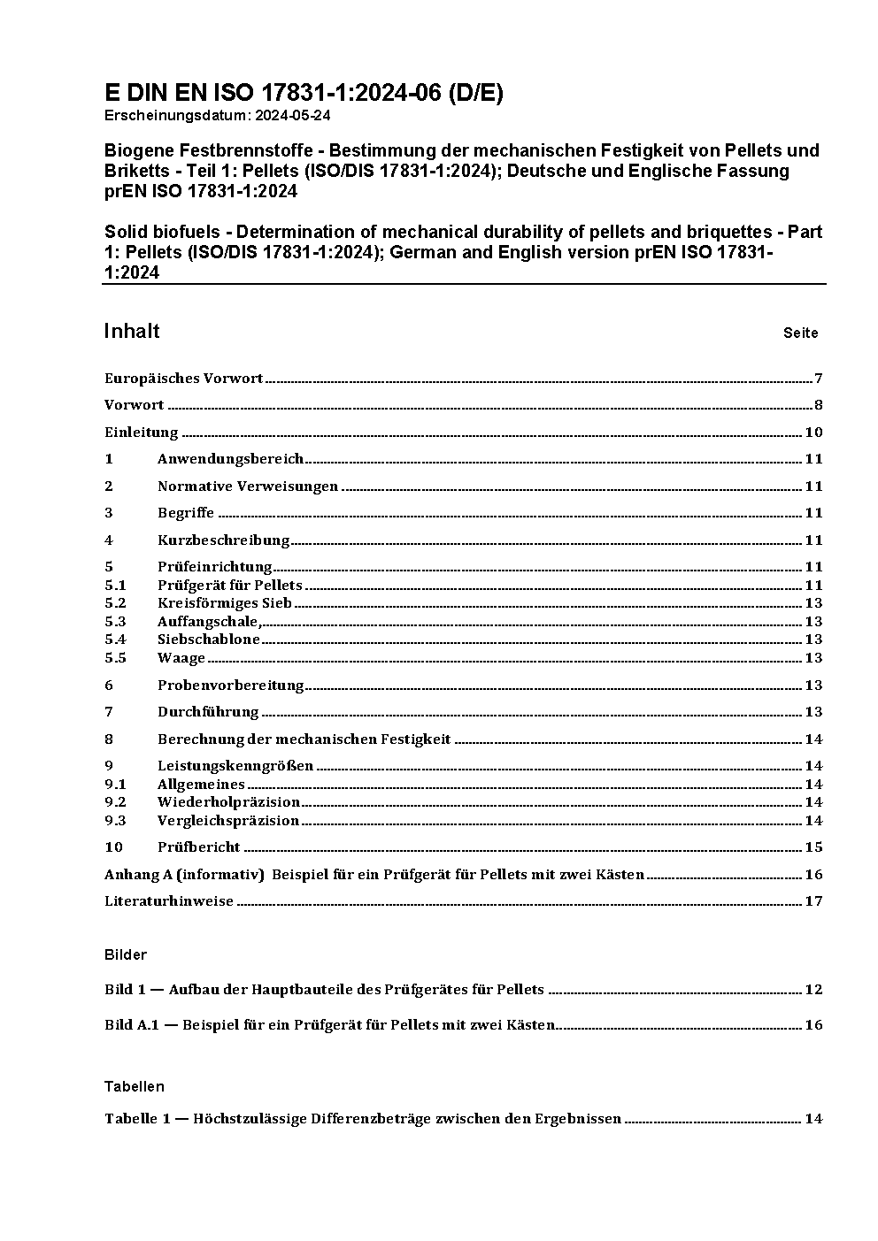 Feste Biobrennstoffe - Bestimmung der mechanischen Festigkeit von Pellets und Briketts - Teil 1: Pellets (ISO/DIS 17831-1:2013); Deutsche Fassung prEN ISO 17831-1:2013