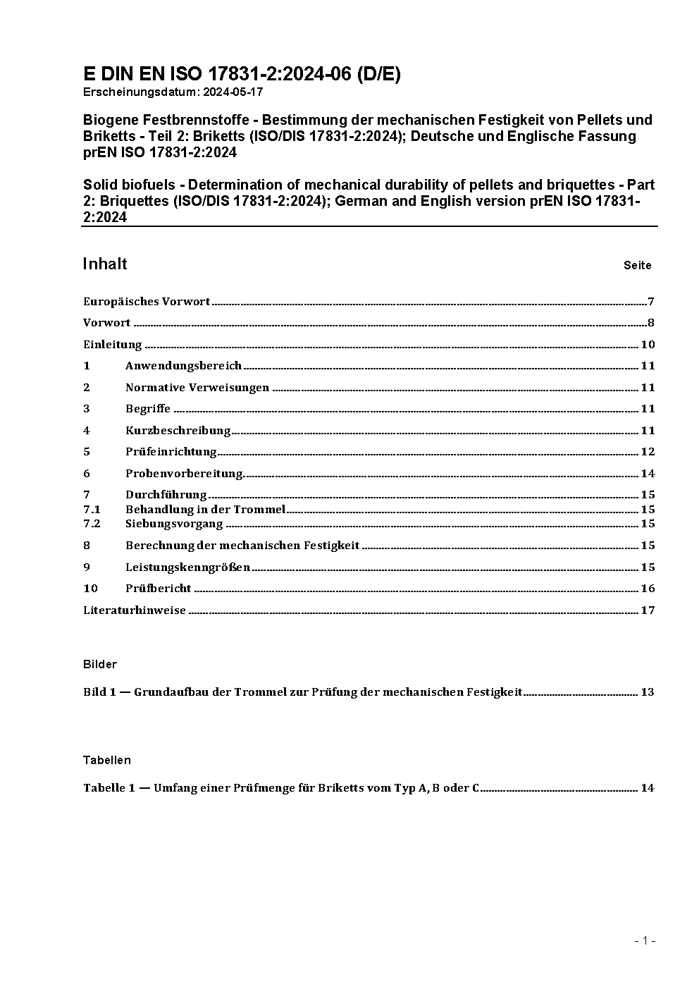 Solid biofuels - Determination of mechanical durability of pellets and briquettes - Part 2: Briquettes (ISO/DIS 17831-2:2024); German and English version prEN ISO 17831-2:2024