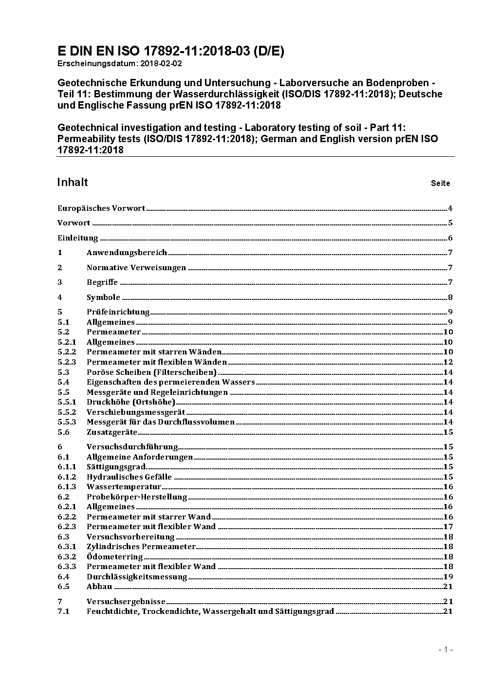 Geotechnische Erkundung und Untersuchung - Laborversuche an Bodenproben - Teil 11: Bestimmung der Wasserdurchlässigkeit (ISO/DIS 17892-11:2018); Deutsche und Englische Fassung prEN ISO 17892-11:2018