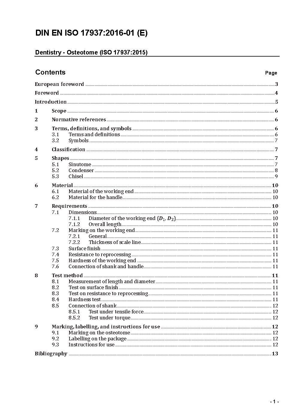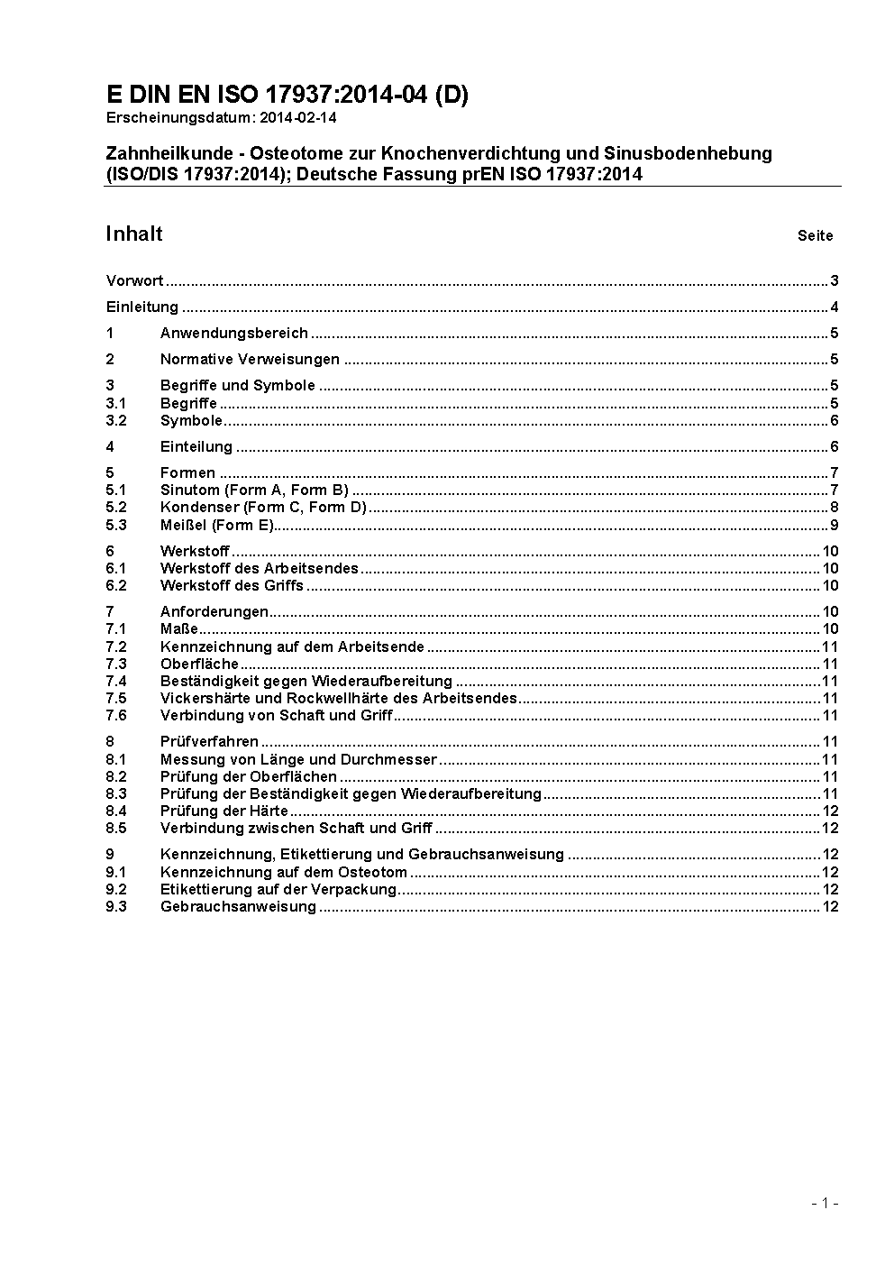 Zahnheilkunde - Osteotome zur Knochenverdichtung und Sinusbodenhebung (ISO/DIS 17937:2014); Deutsche Fassung prEN ISO 17937:2014