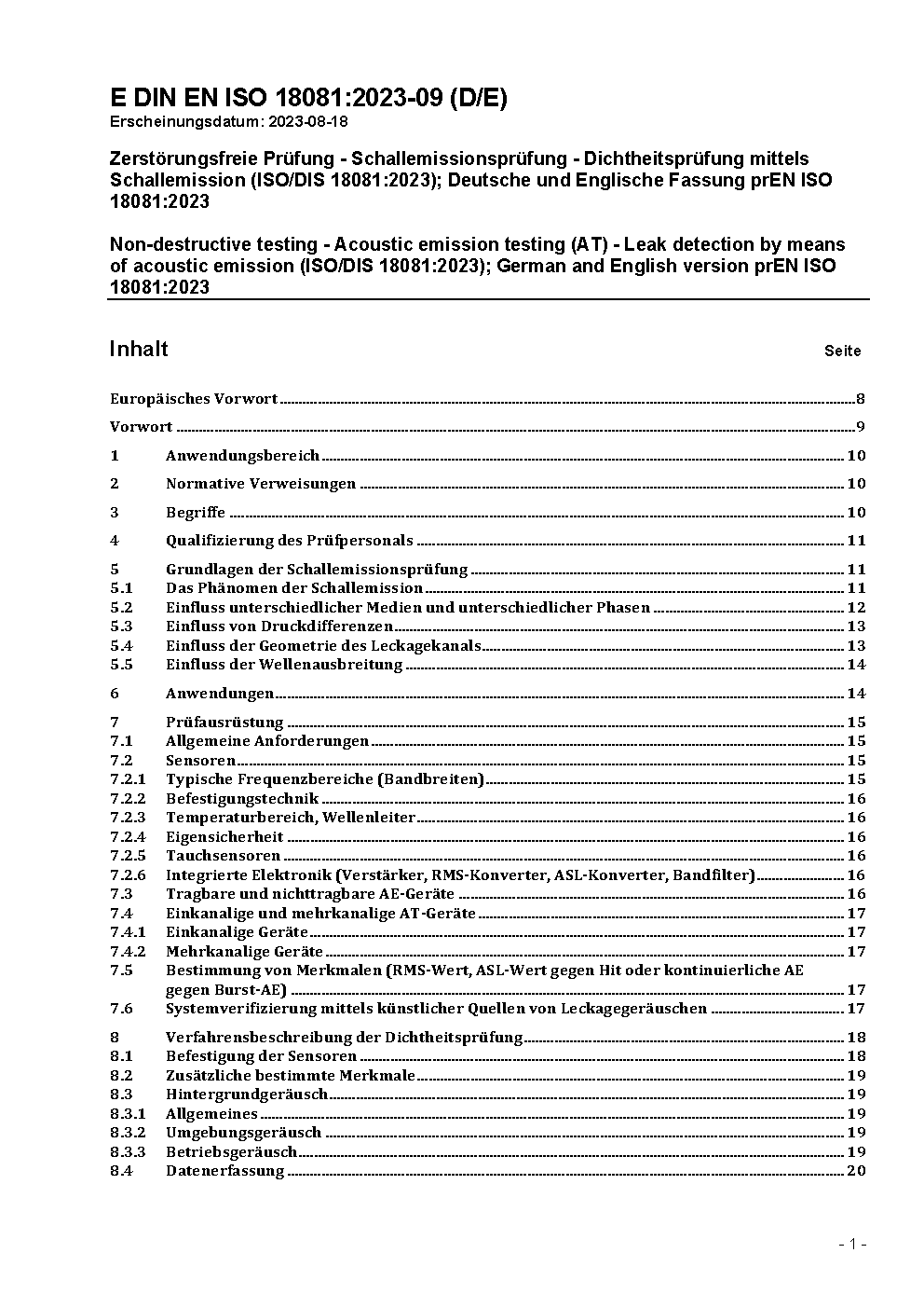 Zerstörungsfreie Prüfung - Schallemissionsprüfung - Dichtheitsprüfung mittels Schallemission (ISO/DIS 18081:2023); Deutsche und Englische Fassung prEN ISO 18081:2023
