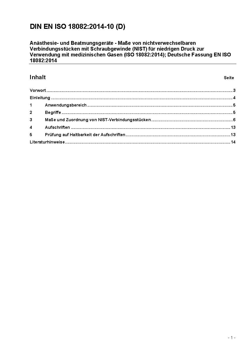 Anaesthetic and respiratory equipment - Dimensions of non-interchangeable screw-threaded (NIST) low-pressure connectors for medical gases (ISO 18082:2014 + Amd. 1:2017); German version EN ISO 18082:2014 + A1:2017
