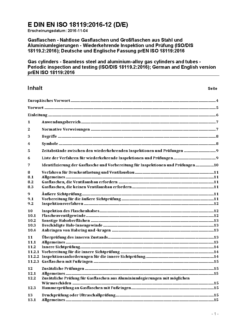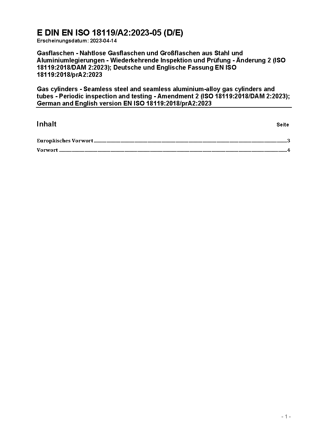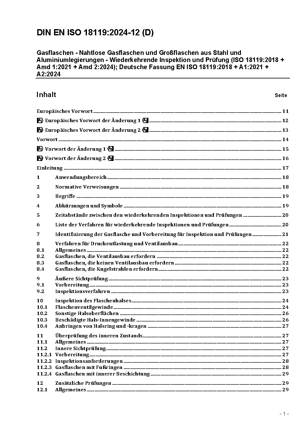 Gasflaschen - Nahtlose Gasflaschen und Großflaschen aus Stahl und Aluminiumlegierungen - Wiederkehrende Inspektion und Prüfung (ISO 18119:2018 + Amd 1:2021 + Amd 2:2024); Deutsche Fassung EN ISO 18119:2018 + A1:2021 + A2:2024
