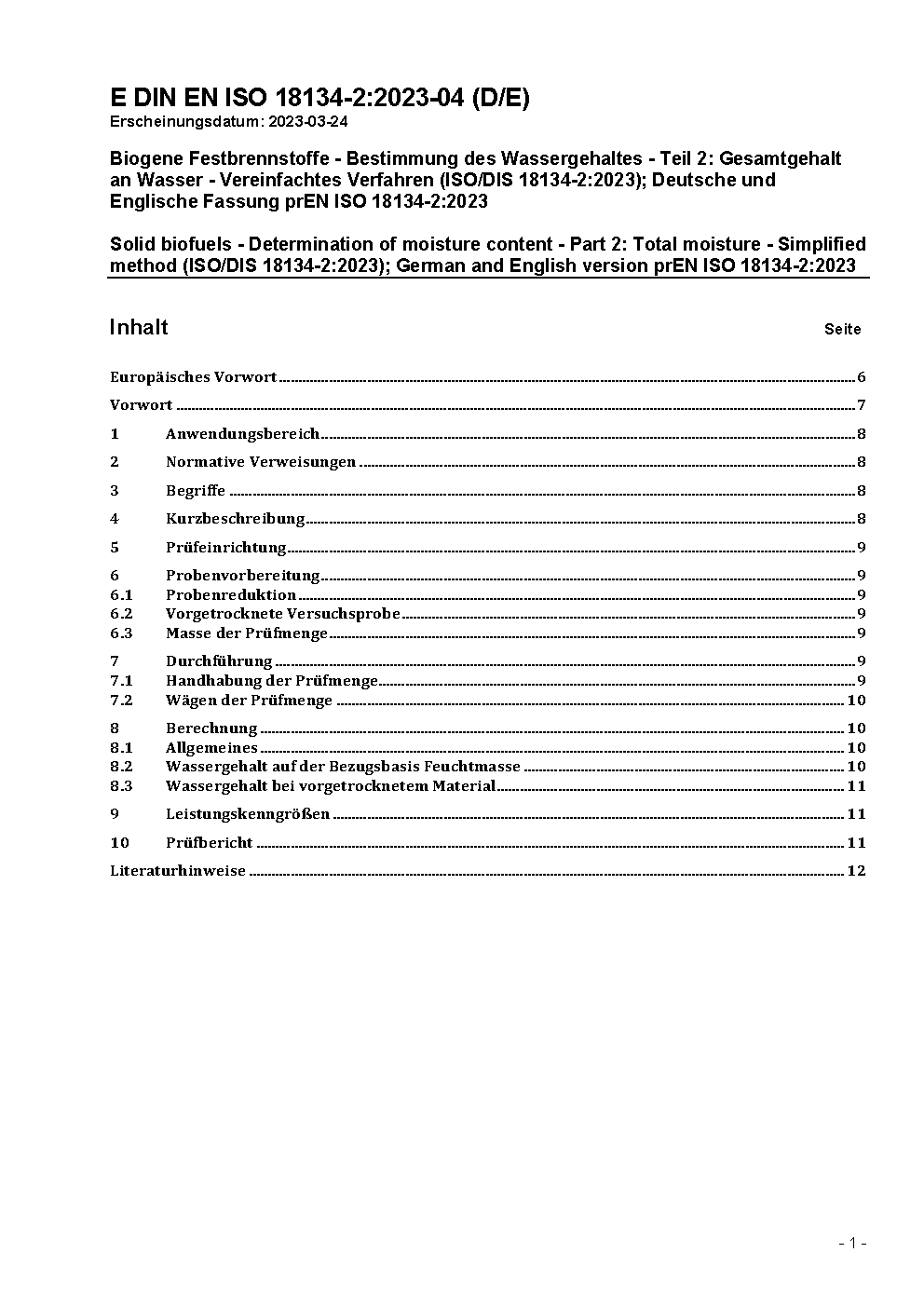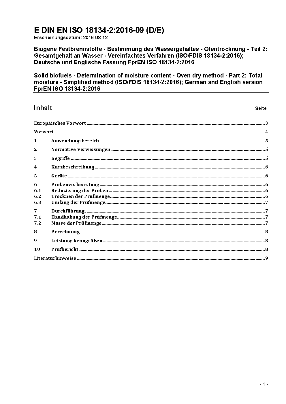 Biogene Festbrennstoffe - Bestimmung des Wassergehaltes - Ofentrocknung - Teil 2: Gesamtgehalt an Wasser - Vereinfachtes Verfahren (ISO/FDIS 18134-2:2016); Deutsche und Englische Fassung FprEN ISO 18134-2:2016