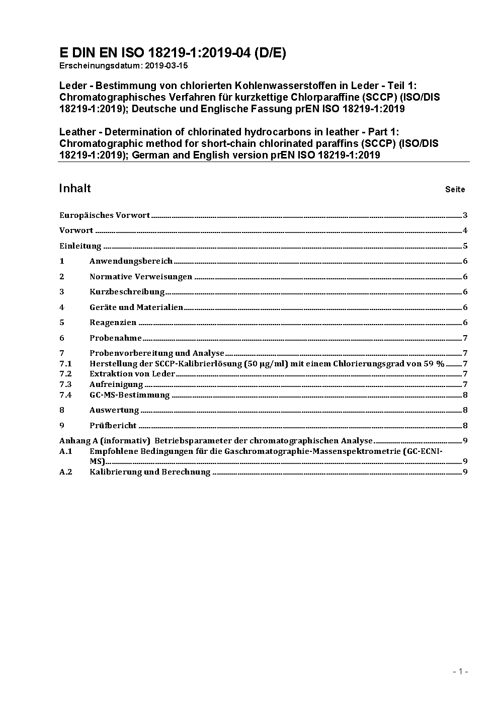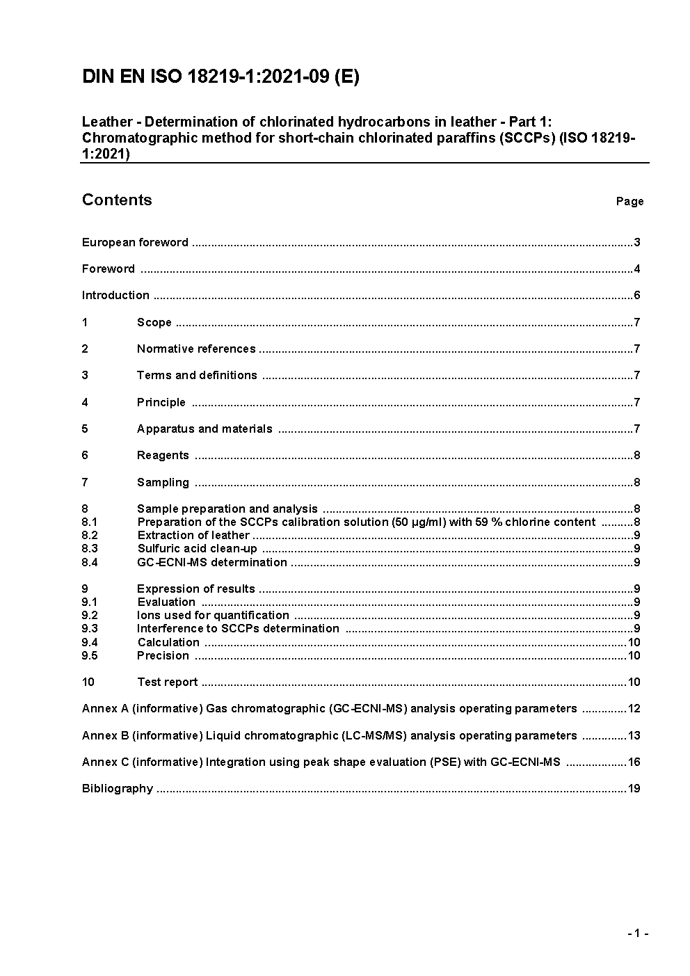 Leder - Bestimmung von chlorierten Kohlenwasserstoffen in Leder - Teil 1: Chromatographisches Verfahren für kurzkettige Chlorparaffine (SCCP) (ISO 18219-1:2021); Deutsche Fassung EN ISO 18219-1:2021