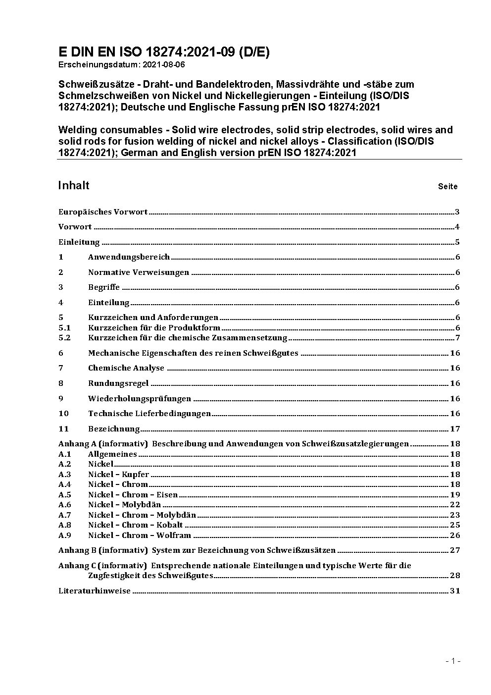 Schweißzusätze - Massivdraht- und Massivbandelektroden, Massivdrähte und -stäbe zum Schmelzschweißen von Nickel und Nickellegierungen - Einteilung (ISO 18274:2023); Deutsche Fassung EN ISO 18274:2023