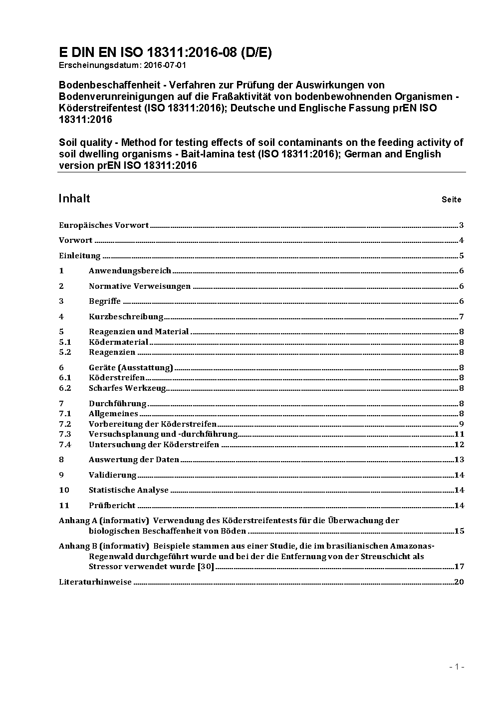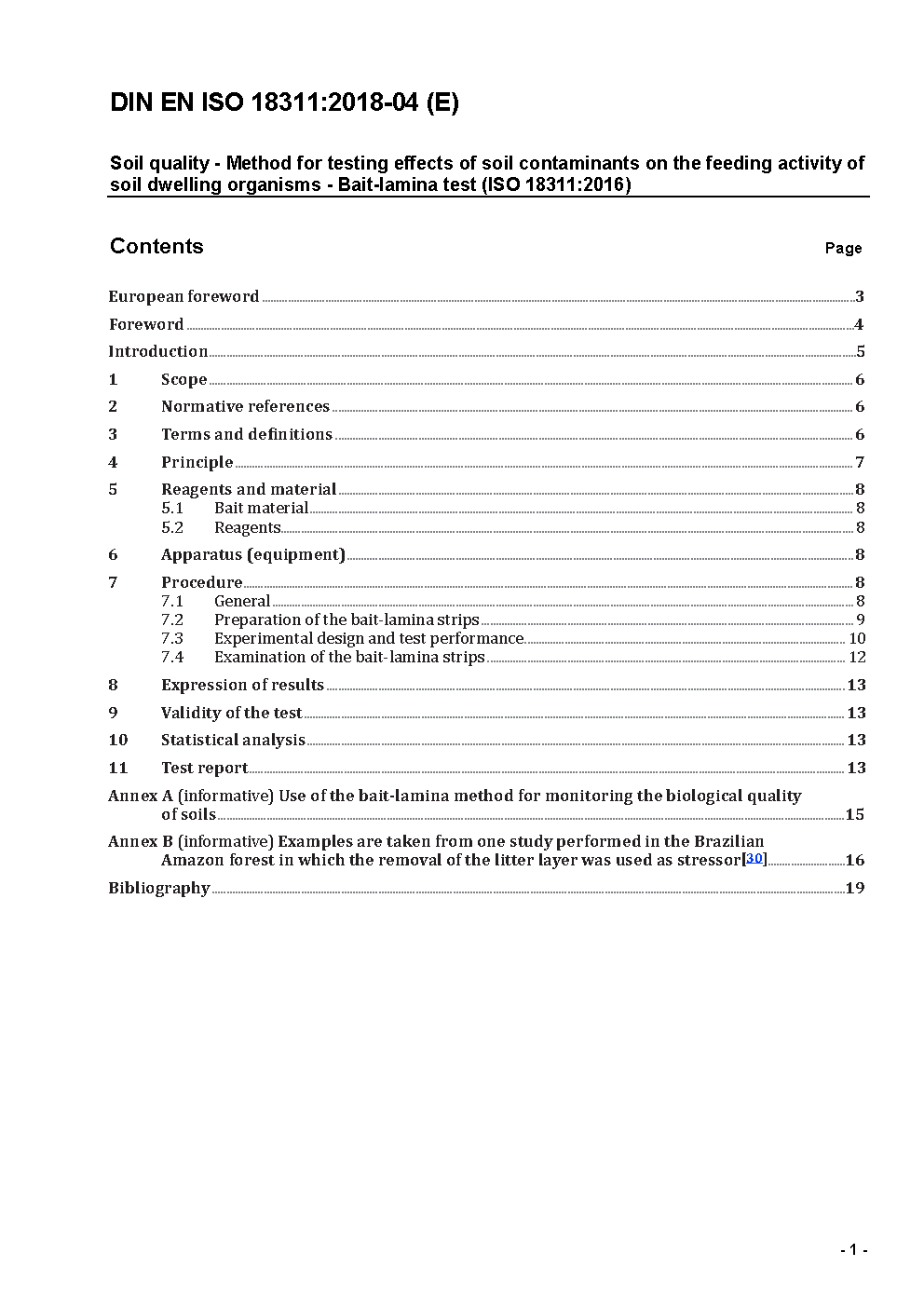 Bodenbeschaffenheit - Verfahren zur Prüfung der Auswirkungen von Bodenverunreinigungen auf die Fraßaktivität von bodenbewohnenden Organismen - Köderstreifentest (ISO 18311:2016); Deutsche Fassung EN ISO 18311:2018