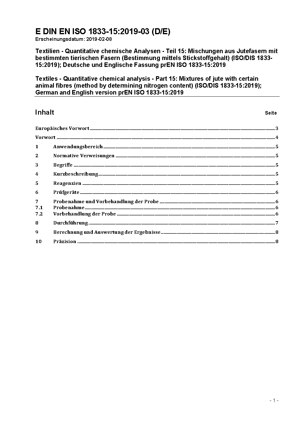 Textiles - Quantitative chemical analysis - Part 15: Mixtures of jute and certain animal fibres (method by determining nitrogen content) (ISO 1833-15:2006); German version FprEN ISO 1833-15:2010