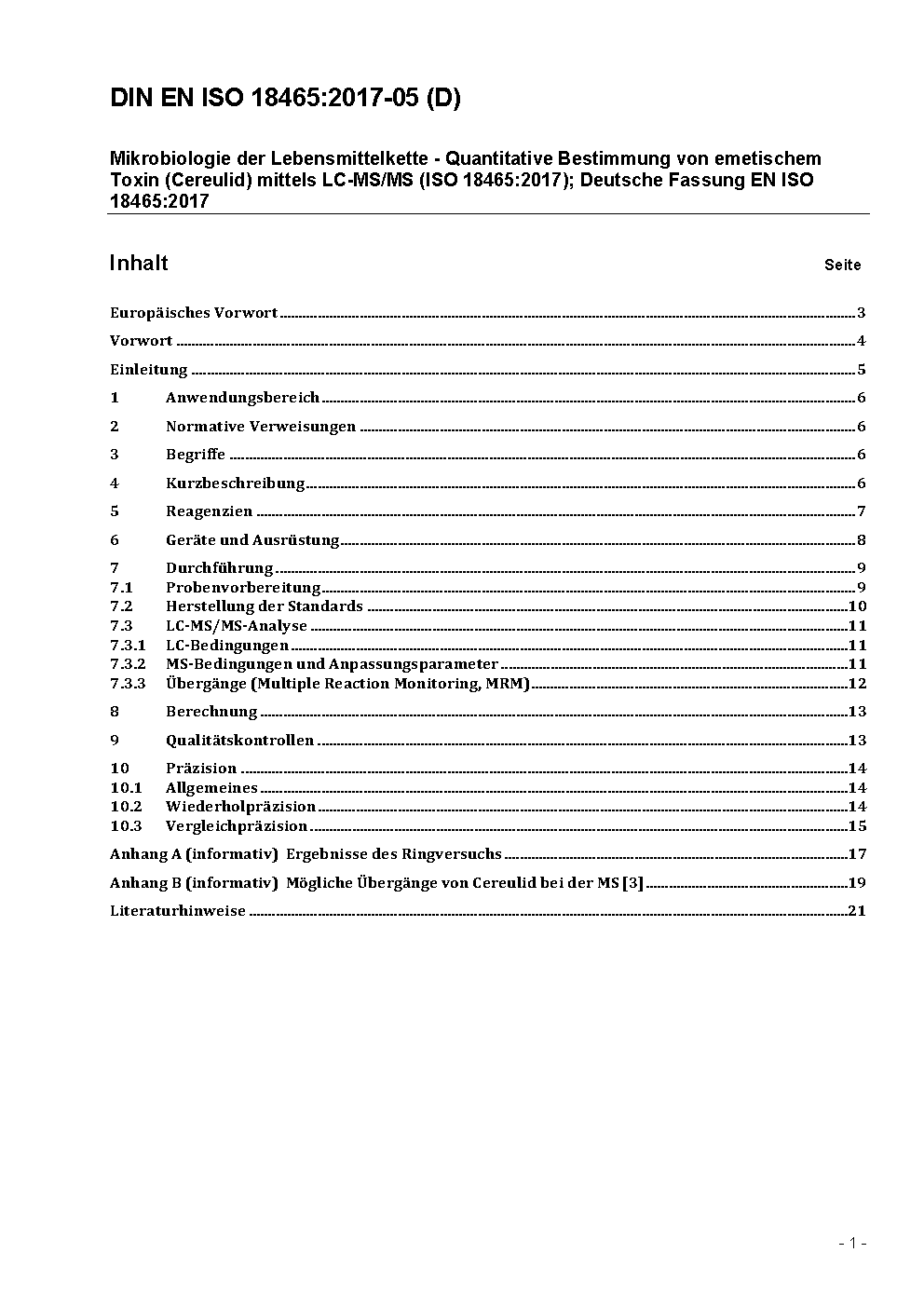 Mikrobiologie der Lebensmittelkette - Quantitative Bestimmung von emetischem Toxin (Cereulid) mittels LC-MS/MS (ISO 18465:2017); Deutsche Fassung EN ISO 18465:2017