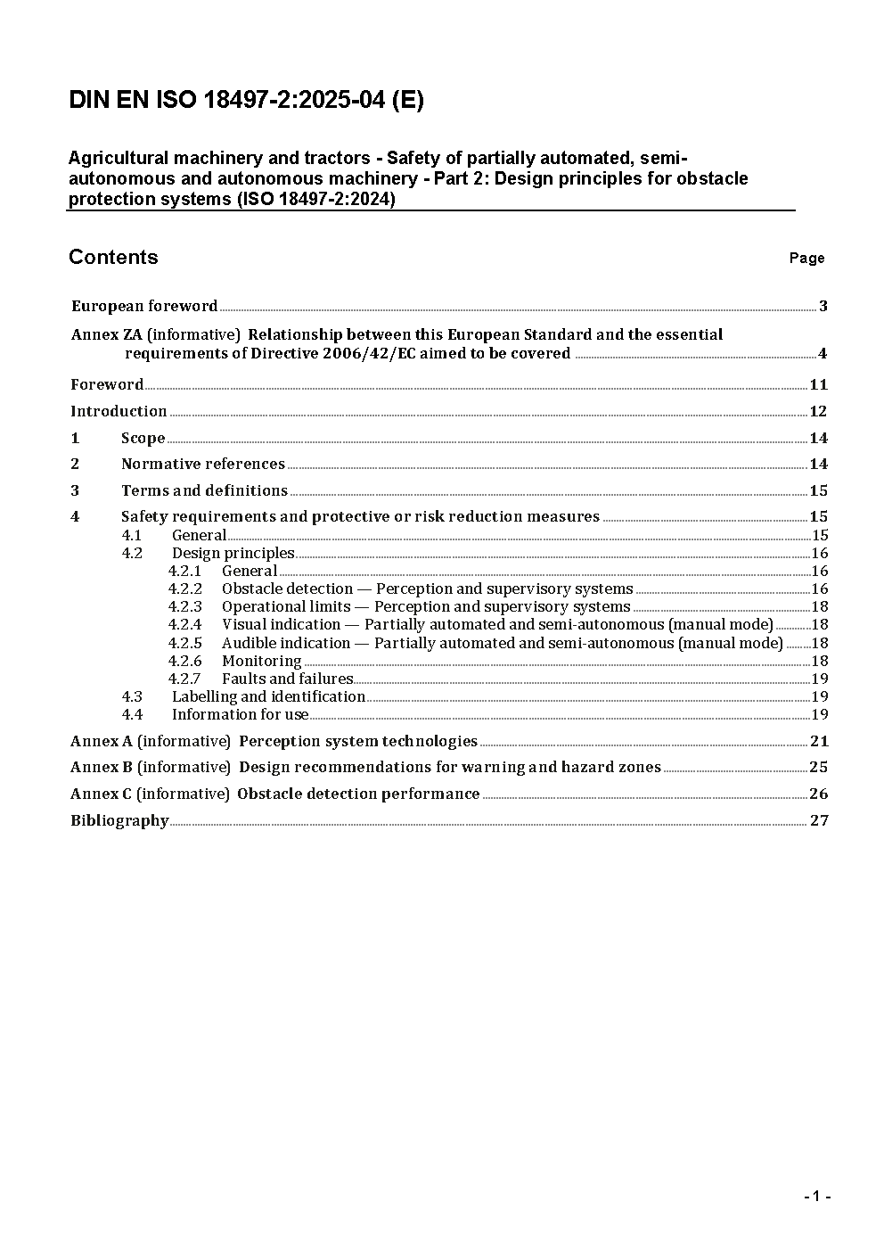 Agricultural machinery and tractors - Safety of partially automated, semi-autonomous and autonomous machinery - Part 2: Design principles for obstacle protection systems (ISO 18497-2:2024); German version EN ISO 18497-2:2024