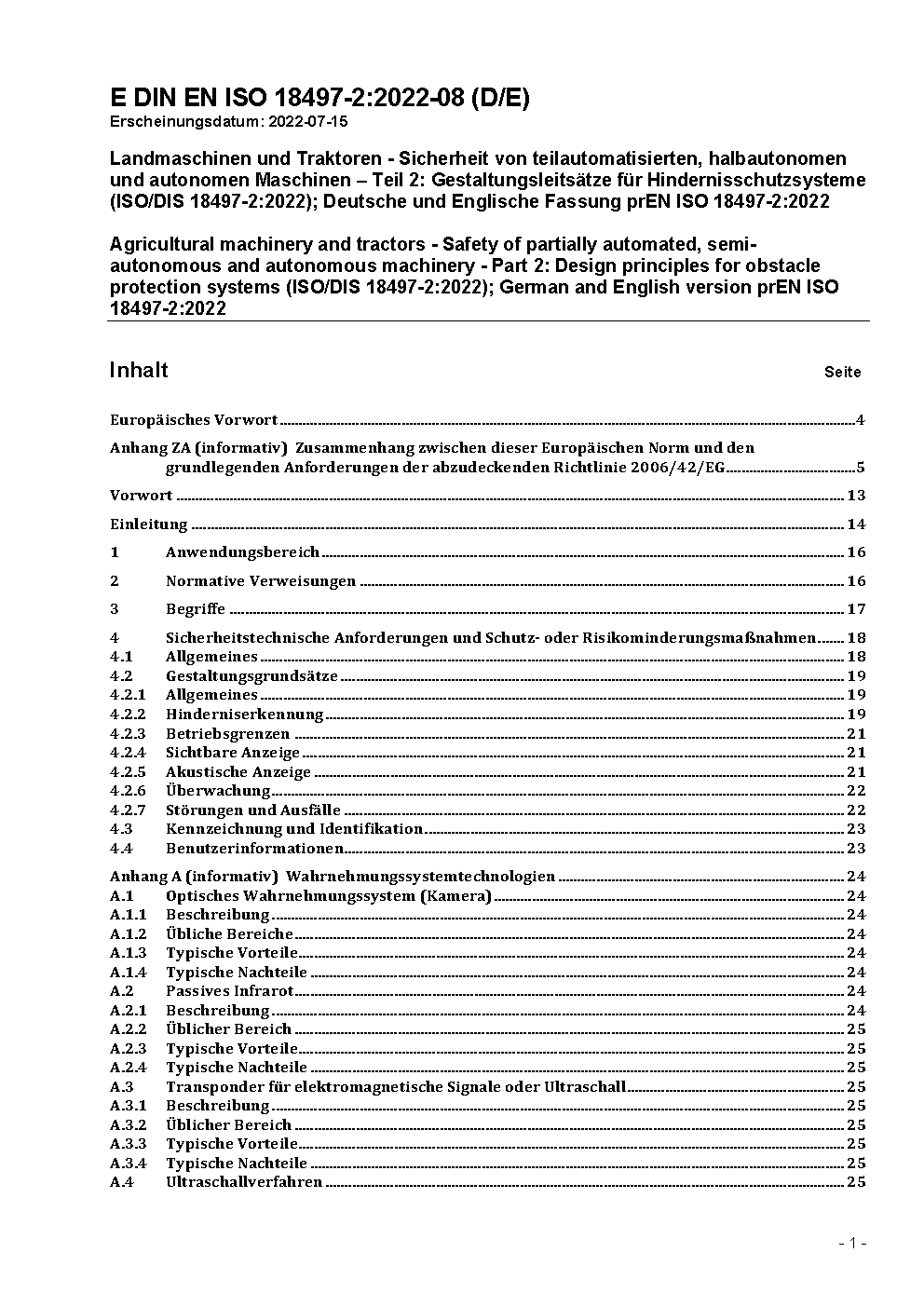 Landmaschinen und Traktoren - Sicherheit von teilautomatisierten, halbautonomen und autonomen Maschinen - Teil 2: Gestaltungsleitsätze für Hindernisschutzsysteme (ISO 18497-2:2024); Deutsche Fassung EN ISO 18497-2:2024