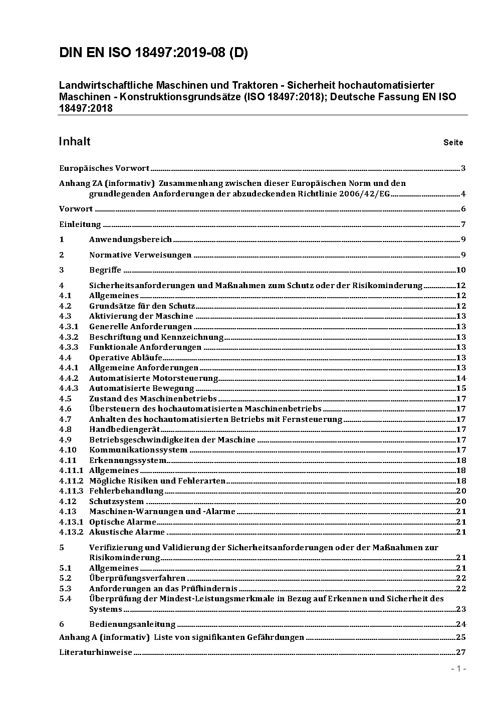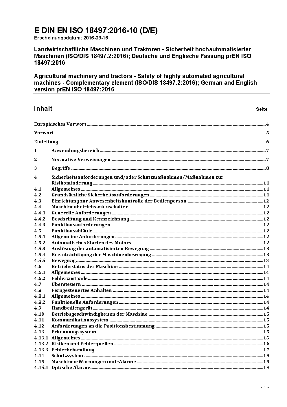 Agricultural machinery and tractors - Safety of highly automated agricultural machines - Complementary element (ISO/DIS 18497.2:2016); German and English version prEN ISO 18497:2016