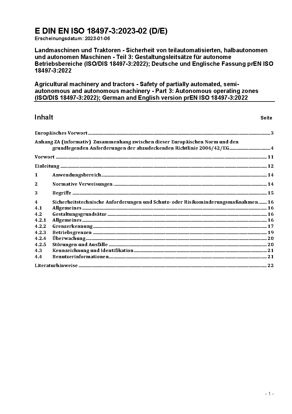 Agricultural machinery and tractors - Safety of partially automated, semi-autonomous and autonomous machinery - Part 3: Autonomous operating zones (ISO/DIS 18497-3:2022); German and English version prEN ISO 18497-3:2022