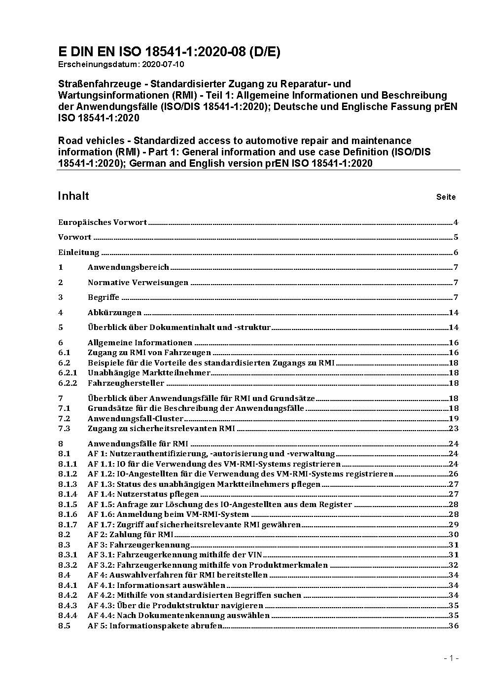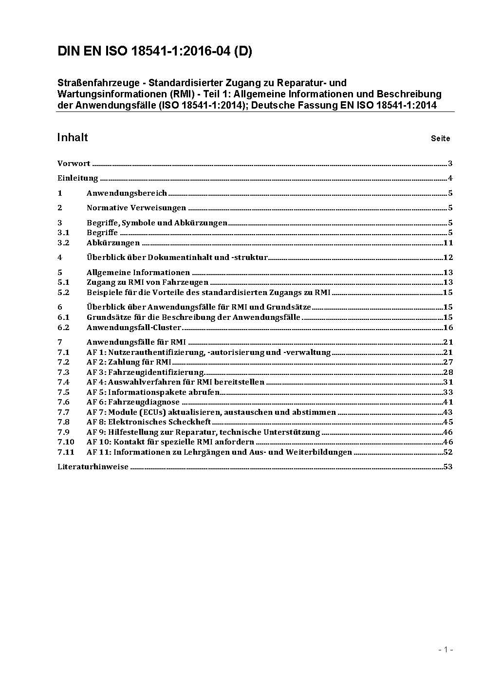 Straßenfahrzeuge - Standardisierter Zugang zu Reparatur- und Wartungsinformationen (RMI) - Teil 1: Allgemeine Informationen und Beschreibung der Anwendungsfälle (ISO 18541-1:2021); Deutsche Fassung EN ISO 18541-1:2021