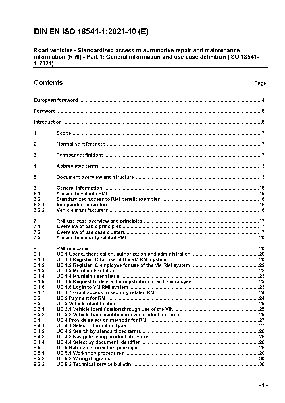 Road vehicles - Standardized access to automotive repair and maintenance information (RMI) - Part 1: General information and use case definition (ISO 18541-1:2021); German version EN ISO 18541-1:2021