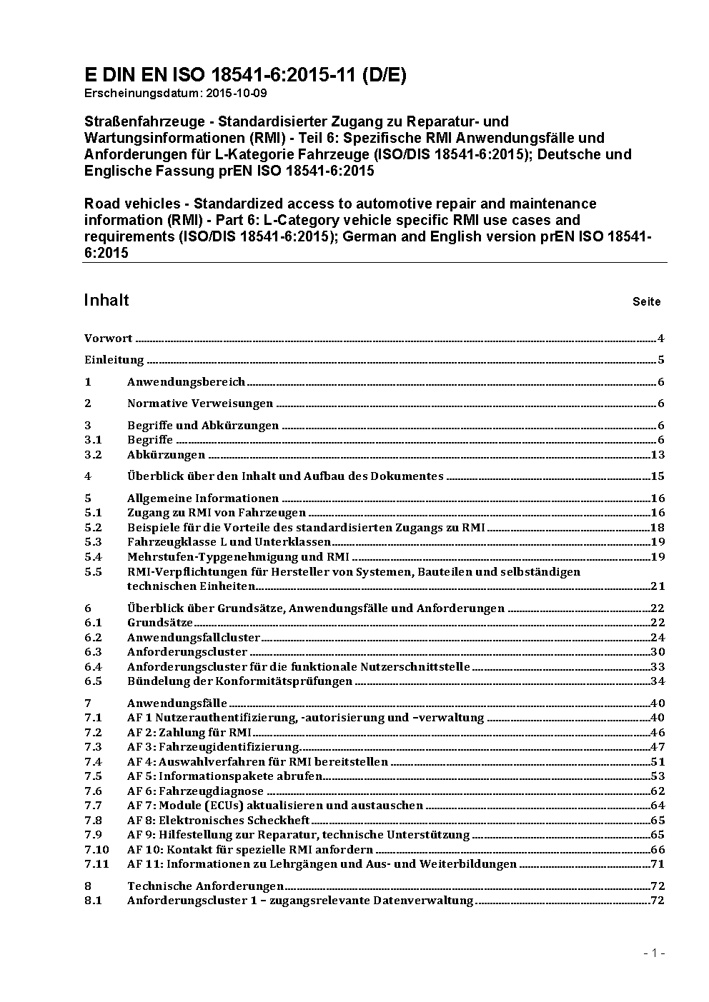 Straßenfahrzeuge - Standardisierter Zugang zu Reparatur- und Wartungsinformationen (RMI) für die Kraftfahrzeugindustrie - Teil 6: Spezifische RMI-Anwendungsfälle und -Anforderungen für Fahrzeuge der Fahrzeugklasse L (ISO 18541-6:2018, korrigierte Fassung 2018-05); Deutsche Fassung EN ISO 18541-6:2018