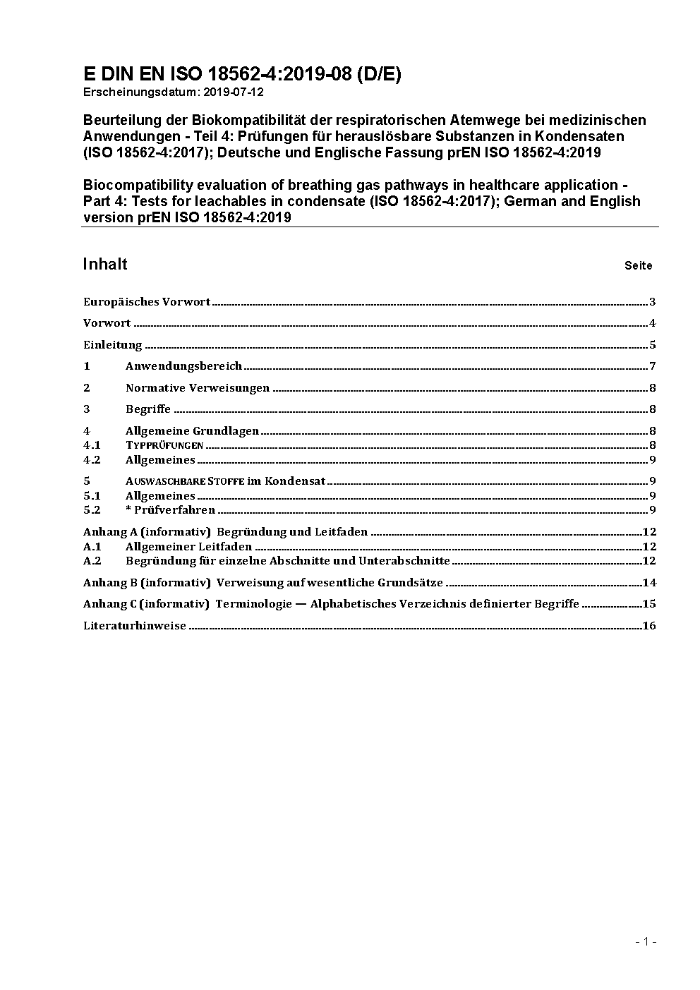 Biocompatibility evaluation of breathing gas pathways in healthcare applications - Part 4: Tests for leachables in condensate (ISO/DIS 18562-4:2022); German and English version prEN ISO 18562-4:2022
