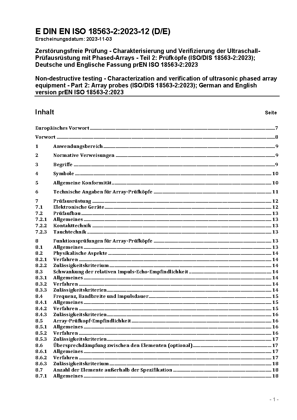 Zerstörungsfreie Prüfung - Charakterisierung und Verifizierung der Ultraschall-Prüfausrüstung mit phasengesteuerten Arrays - Teil 2: Prüfköpfe (ISO/DIS 18563-2:2016); Deutsche und Englische Fassung prEN ISO 18563-2:2016
