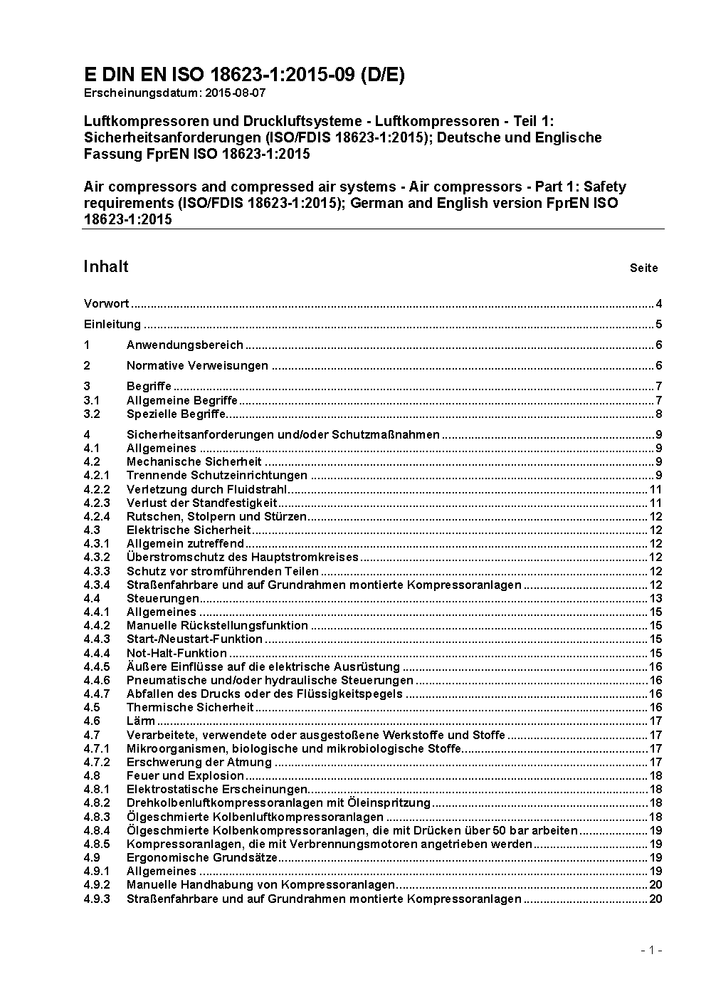 Air compressors and compressed air systems - Part 1: Air compressor safety requirements (ISO/DIS 18623-1:2023); German and English version prEN ISO 18623-1:2023
