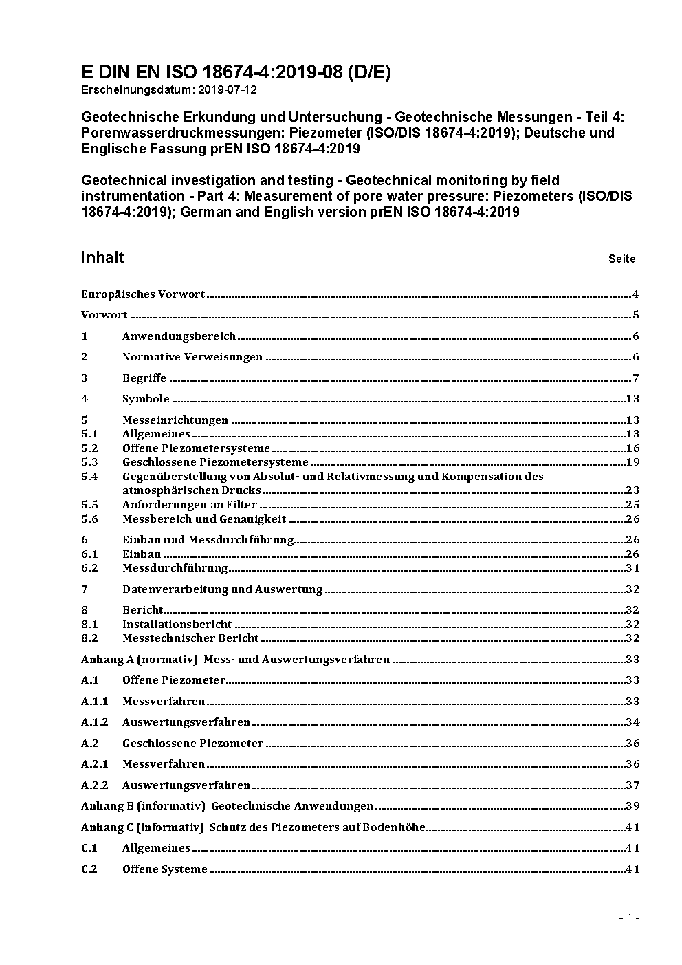 Geotechnische Erkundung und Untersuchung - Geotechnische Messungen - Teil 4: Porenwasserdruckmessungen: Piezometer (ISO/DIS 18674-4:2019); Deutsche und Englische Fassung prEN ISO 18674-4:2019